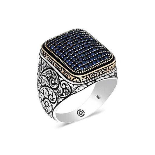 Gemusterter quadratischer Herren-Silberring mit blauem Zirkon