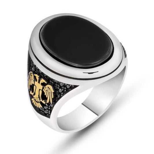Herren-Silberring mit Doppeladler aus schwarzem Stein