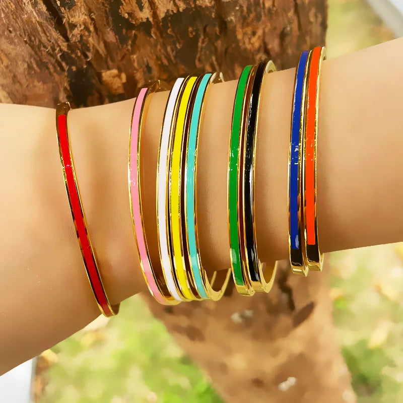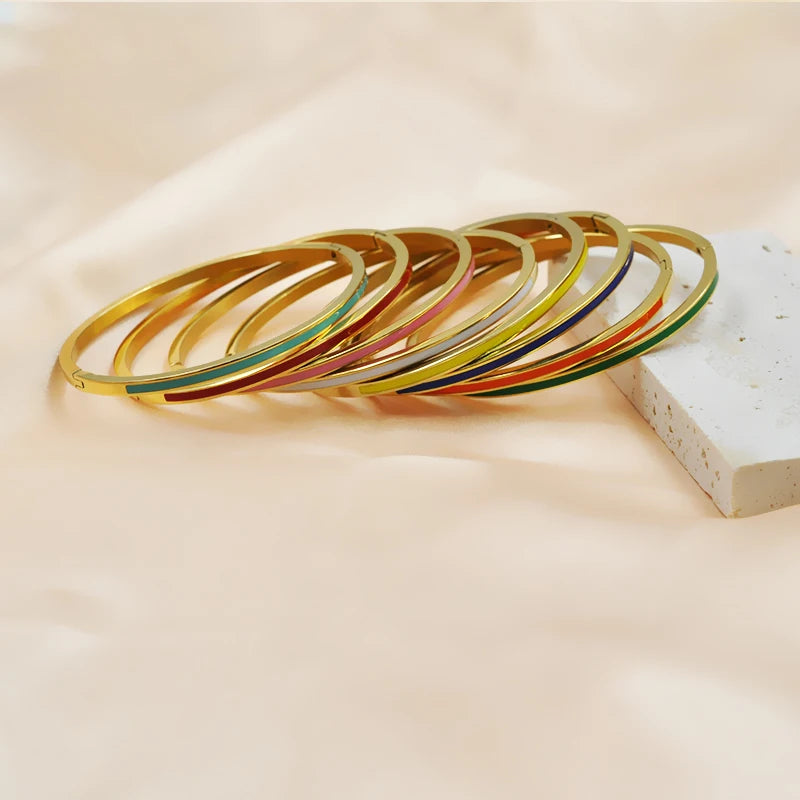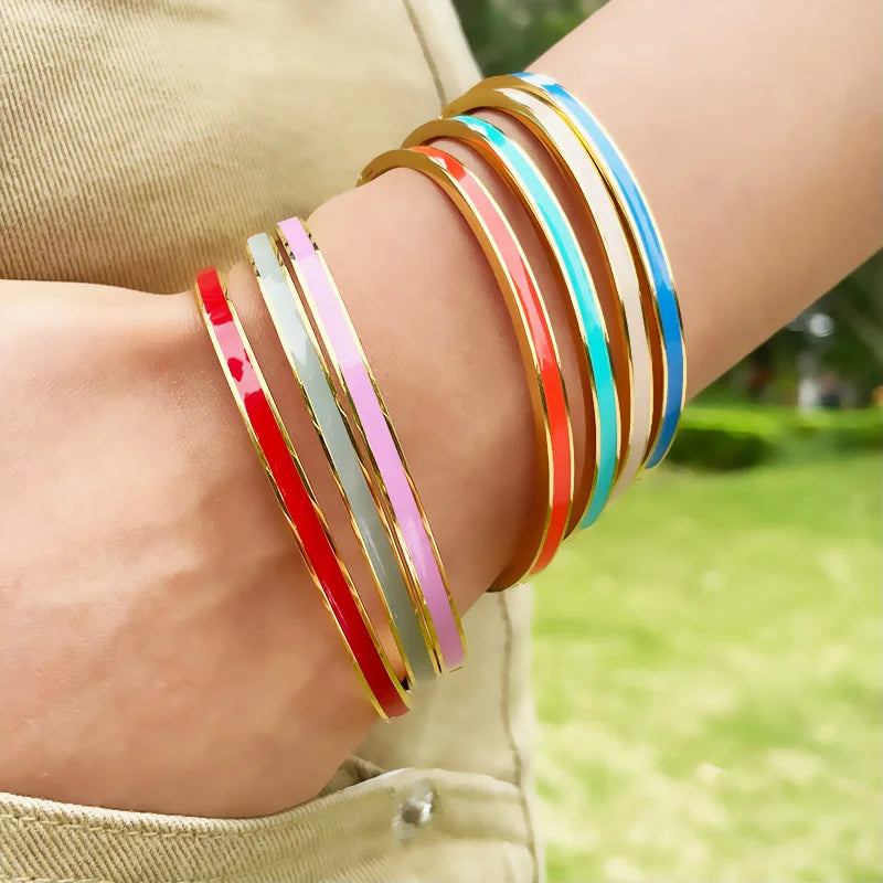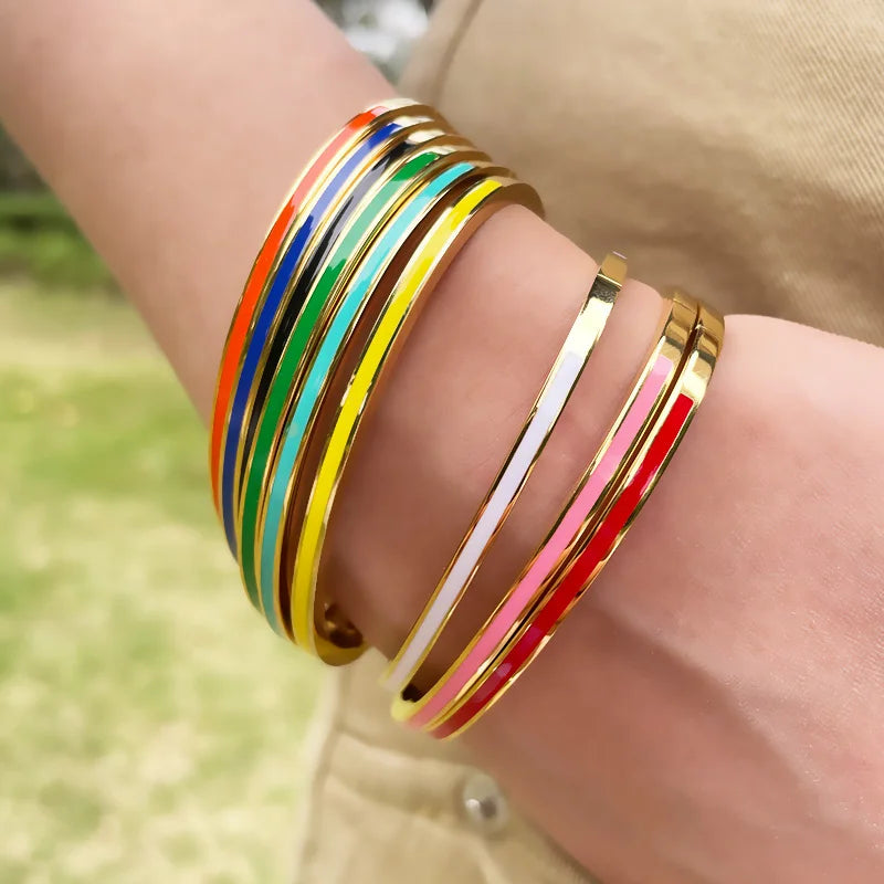 Details Material Edelstahl mit bunter Emaille-Einlage Stil Süß/Romantisch, Schick, Trendy, Dünner Armreif, Armbänder für Liebhaber Eigenschaften Erhältlich in 3mm und 5mm Breite. Leuchtende Emaille-Farben. Anlaufgeschützt, Wasserdicht, Hypoallergen. Passform Standard-Armreif/Manschette Geschlecht Damen
