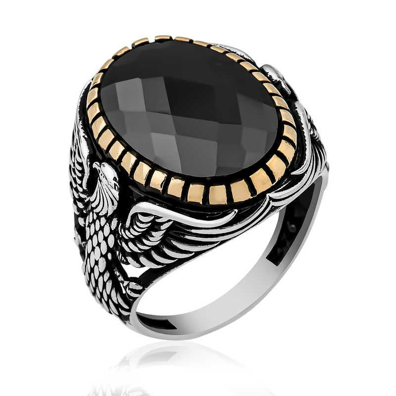 Der Adler, bekannt als König der Vögel und auf die Erde herabgestiegen, um zu kämpfen, wird besonders als Krieger und Mächtiger angesehen; daher ist er zum Symbol vieler Nationen geworden. Inspiriert von dieser tiefen Bedeutung ist dieser Herrenring auf beiden Seiten mit geschliffenen Steinen und Adlerfiguren versehen; Sie können ihn sich selbst oder Ihren Lieben zum Geburtstag, zum Vatertag und zu besonderen Anlässen schenken. Dieser stilvolle Herrenring ist aus 925er Sterlingsilber gefertigt. Er verfügt über eine oxidierte Oberfläche, die ihm ein authentisches Aussehen verleiht. Wie alle Herrenringe ist auch dieser Silberring mit geschliffenen Steinen und Adlerfigur handgefertigt. Aufgrund von Silber und Edelsteinen kann das Produktgewicht um ±10 % variieren.