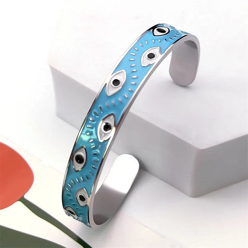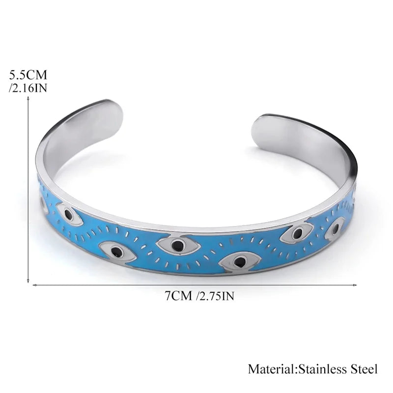 Details Material Edelstahl mit Emaille-Einlage Stil Boho, Ästhetik, Glücksschmuck, spirituelles Amulett, Truthahnauge, Unisex Eigenschaften Buntes Emaille-Motiv „Böser Blick“. Verstellbares offenes Manschettendesign. Anlaufgeschützt, wasserdicht, hypoallergen. Passform: Verstellbares offenes Armreif (Manschette). Geschlecht: Unisex (Männer & Frauen, Paare).
