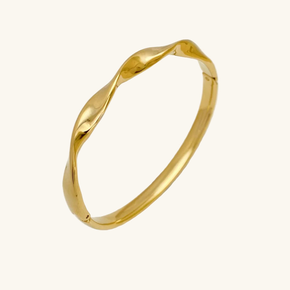 Skulpturale Eleganz: Der unregelmäßig gedrehte Armreif, aus Gold geschmiedet.