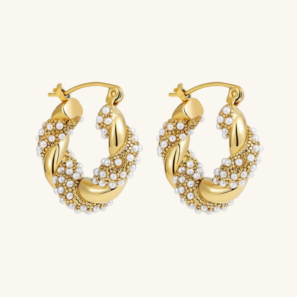 Dezenter Glamour: Gepflasterte Zirkonia- und Perlen-Twist-Creolen.