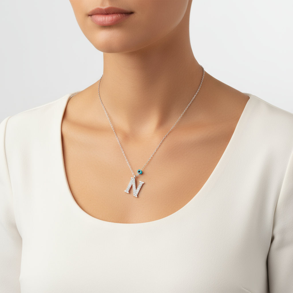 N Buchstabe Evil Eye Rhodium Damen Silber Halskette