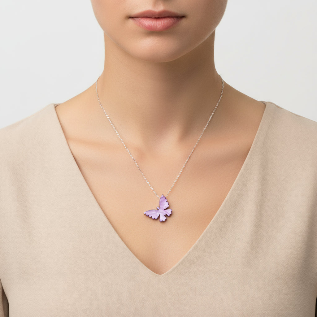 Schmetterlinge symbolisieren Freiheit, Unschuld und Reinheit und sind Ausdruck unverfälschter Liebe und Zuneigung. Die Frühlings-Schmetterlingskette stellt dar, wie Liebe mit einem kleinen Funken beginnt, mit viel Geduld wächst und schließlich in einer Liebeserklärung gipfelt. Diese lila Schmetterlingskette für Damen, die Sie und Ihre Liebsten gerne tragen werden, ist eines der schönsten Geschenke. Die Kette ist aus 925er Sterlingsilber gefertigt und rhodiniert. Silberne Damenketten mit Rhodinierung behalten lange ihren Glanz und verzögern das Anlaufen. Die Silberkette hat eine durchschnittliche Länge von 45 cm. Wie alle silbernen Damenketten ist auch diese lila Schmetterlingskette handgefertigt. Aufgrund des Silbers und der Edelsteine kann das angegebene Produktgewicht um ±10 % abweichen.