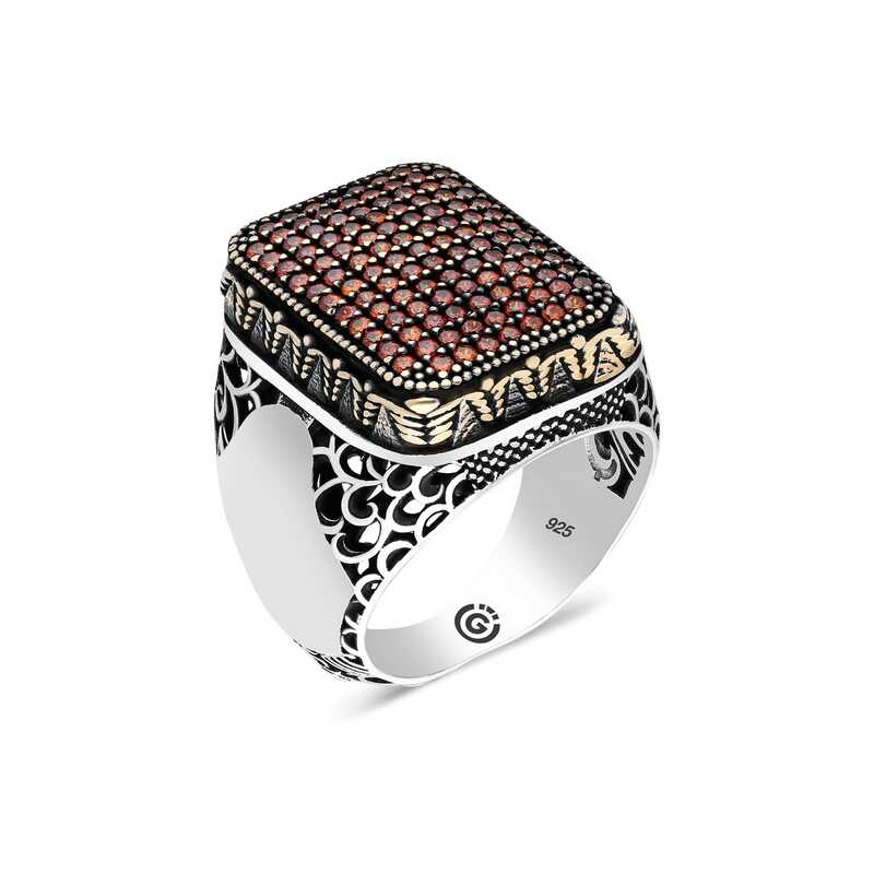 Quadratischer Herren-Silberring mit rotem Zirkonstein
