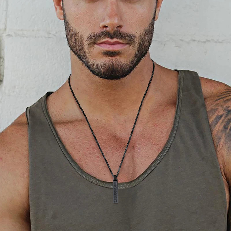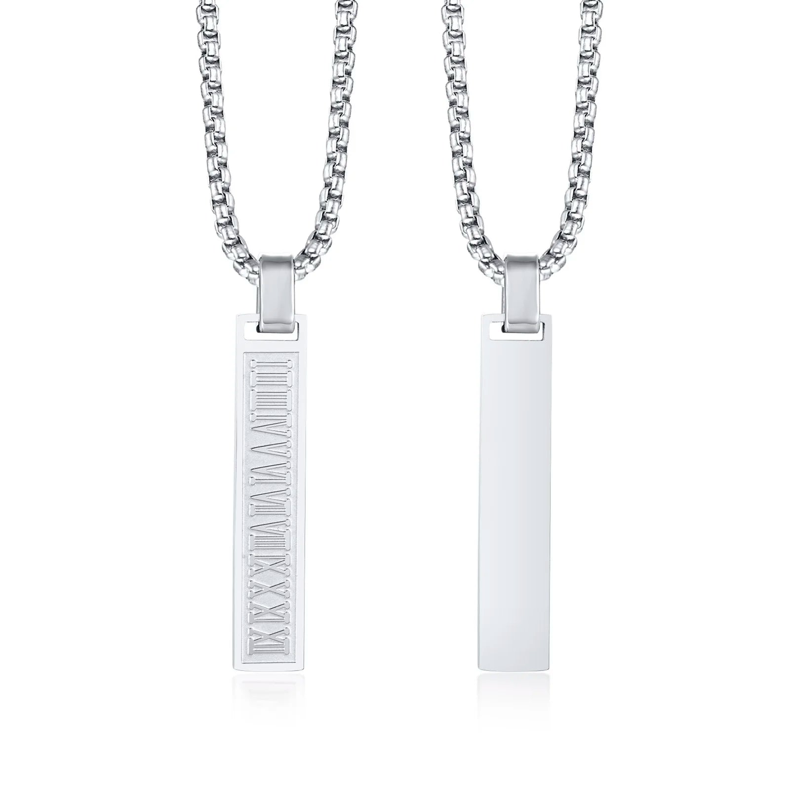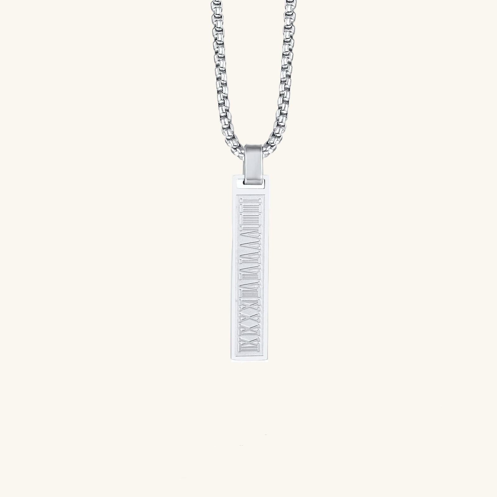 Der vertikale Anhänger mit eingravierten römischen Ziffern verleiht einen modernen, punkinspirierten Touch, während die 24-Zoll-Gliederkette für einen bequemen Sitz sorgt.