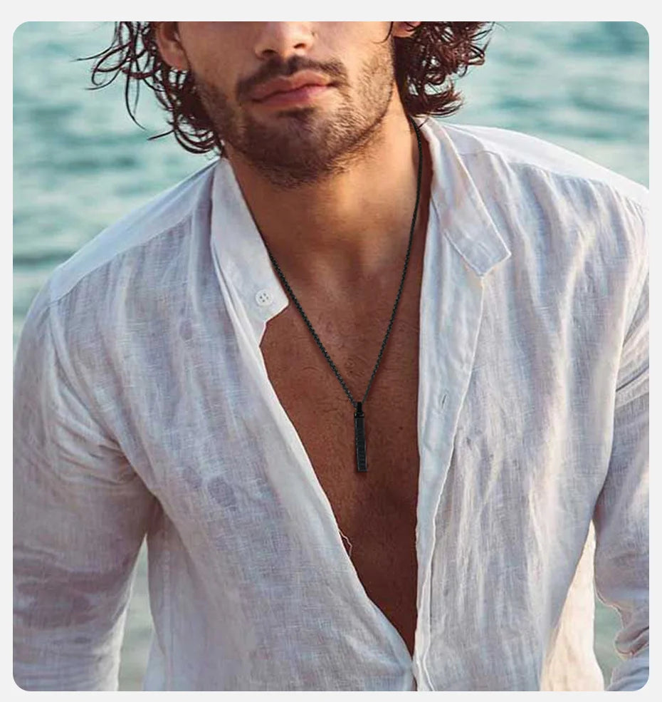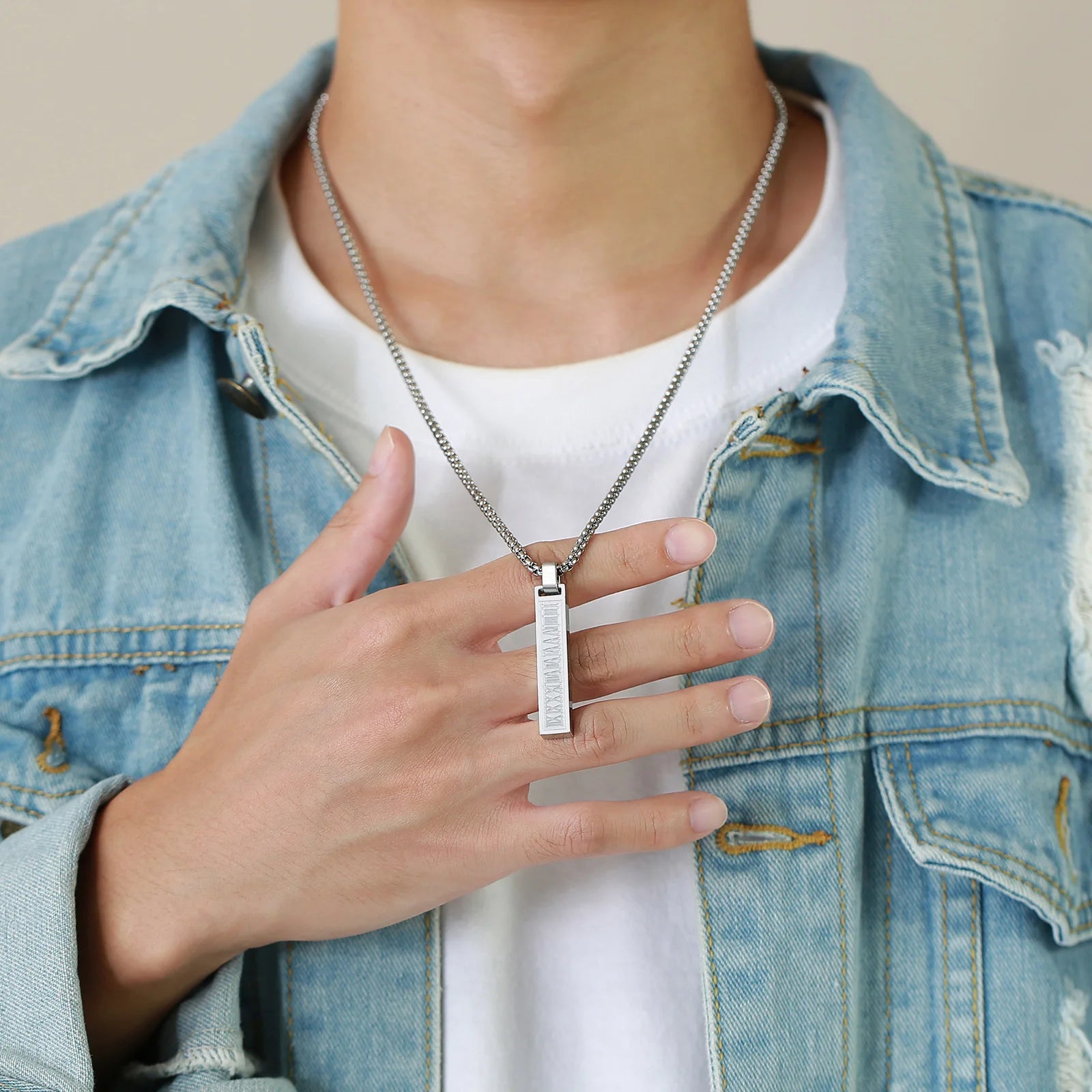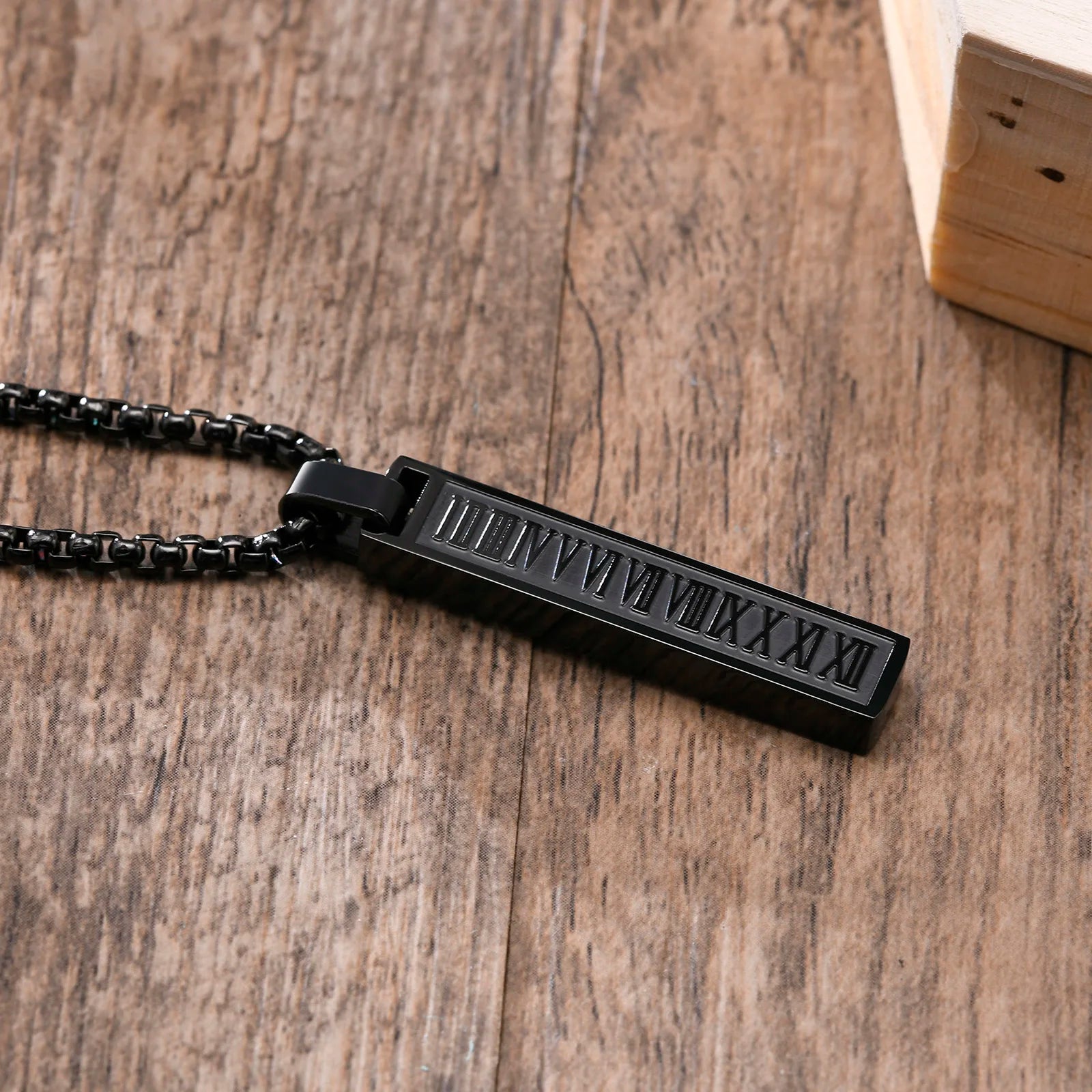 Der vertikale Anhänger mit eingravierten römischen Ziffern verleiht einen modernen, punkinspirierten Touch, während die 24-Zoll-Gliederkette für einen bequemen Sitz sorgt.