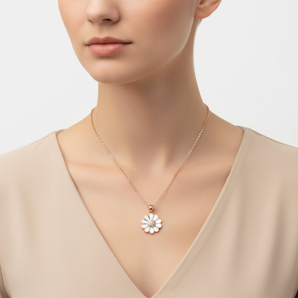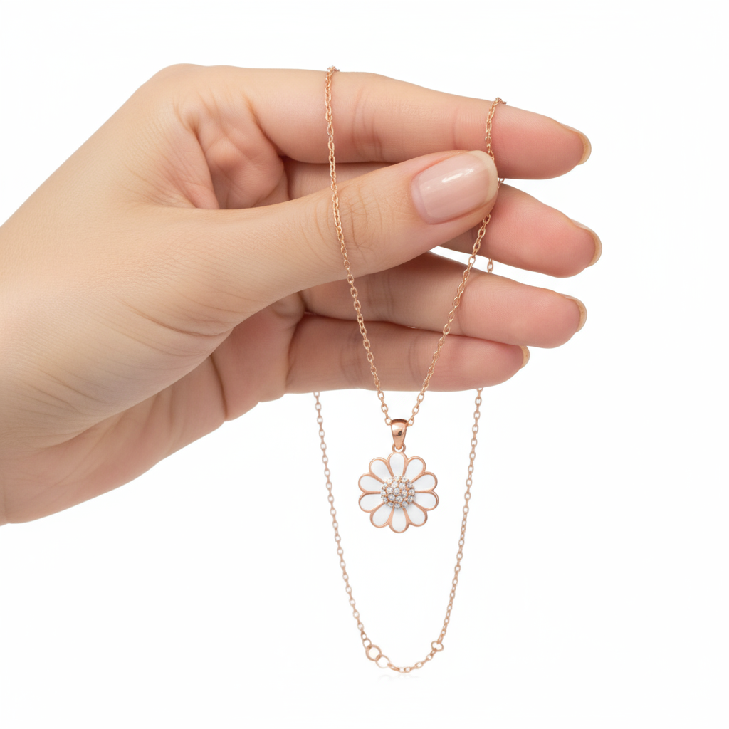 Die Gänseblümchenblüte steht für pure Liebe. Eines ihrer schönsten Merkmale ist, dass sich an jedem Stiel eine Blüte befindet. Diese Schönheit wurde entworfen, um diese funkelnde, mit Zirkonsteinen verzierte Halskette zu kreieren ... Diese elegante Halskette ist eine ausgezeichnete Geschenkwahl für Geburtstage, Valentinstag oder als Geschenk für Mütter zu besonderen Anlässen. Die silberne Gänseblümchen-Damenkette ist aus 925er Sterlingsilber gefertigt. Diese Halskette ist rosévergoldet. Produkte mit rosévergoldeter Beschichtung behalten lange ihren Glanz und verleihen der Silberfarbe einen rosa Farbton. Die funkelnden Steine darauf sind Zirkone. Wie alle silbernen Damenkettenmodelle ist auch die silberne Gänseblümchen-Damenkette handgefertigt. Aufgrund von Silber und Edelsteinen kann das angegebene durchschnittliche Produktgewicht um ±10 % abweichen.
