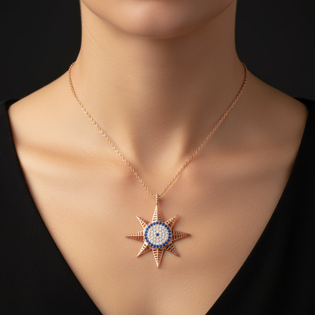 Rosévergoldete Damen-Silberkette mit bösem Blick und Nordstern