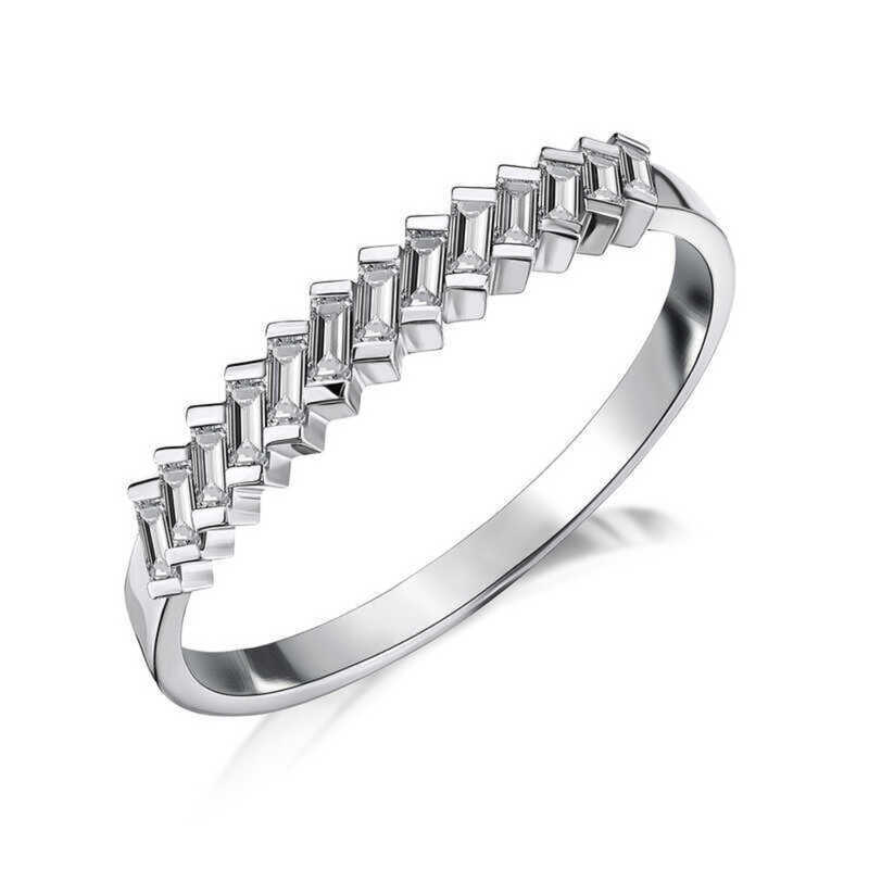 Dieses elegante Ringmodell, verziert mit funkelnden Baguette-Steinen, ist eine sehr schicke Option für besondere Anlässe wie ein Geburtstagsgeschenk, ein Valentinstagsgeschenk oder ein Geschenk für Mütter. Dieser Ring im Halb-Voll-Ewigkeitsstil ist aus 925er Sterlingsilber gefertigt. Das Silber ist rhodiniert. Rhodinierte Silberringe behalten lange ihren Glanz und laufen langsamer an. Die Steine sind im Baguette-Schliff. Wie alle Damenringe aus Silber ist auch dieses Damenringmodell mit sequentiellen Baguette-Steinen handgefertigt. Aufgrund von Silber und Edelsteinen kann das angegebene durchschnittliche Produktgewicht um ±10 % abweichen.