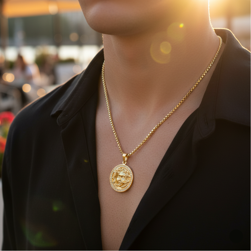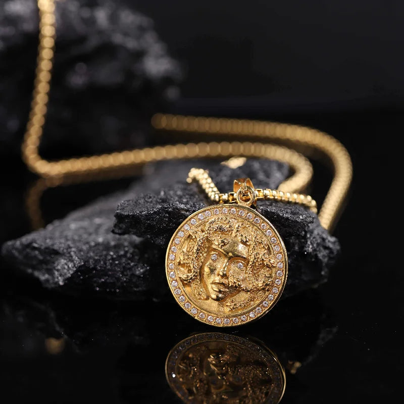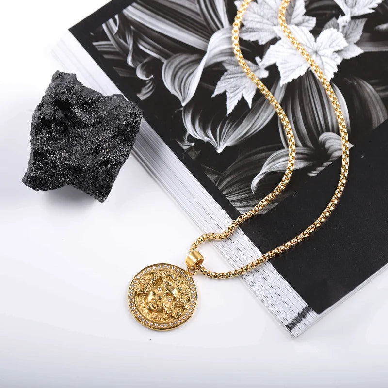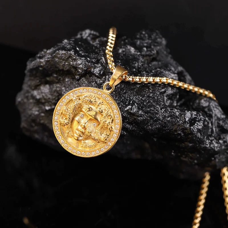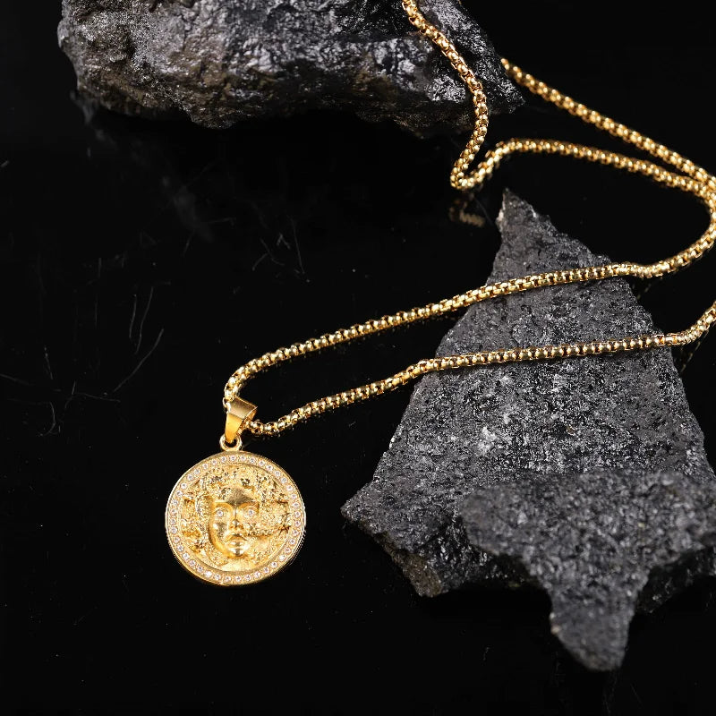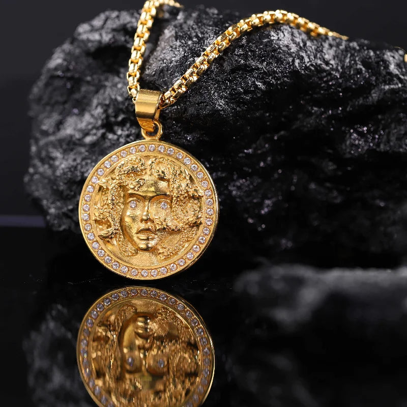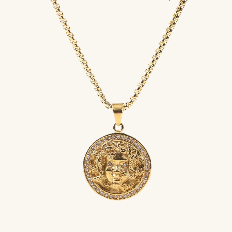 Material: Zertifizierter Edelstahl 316L (erhältlich in Gold oder Silber). Eigenschaften: Wasserdicht, anlaufgeschützt und hypoallergen. Stil: Gothic, Punk, Schutzamulett, mythologische, feministische Ikone. Design: Das Medusa-Gorgonenkopf-Medaillon. Geschlecht: Unisex.