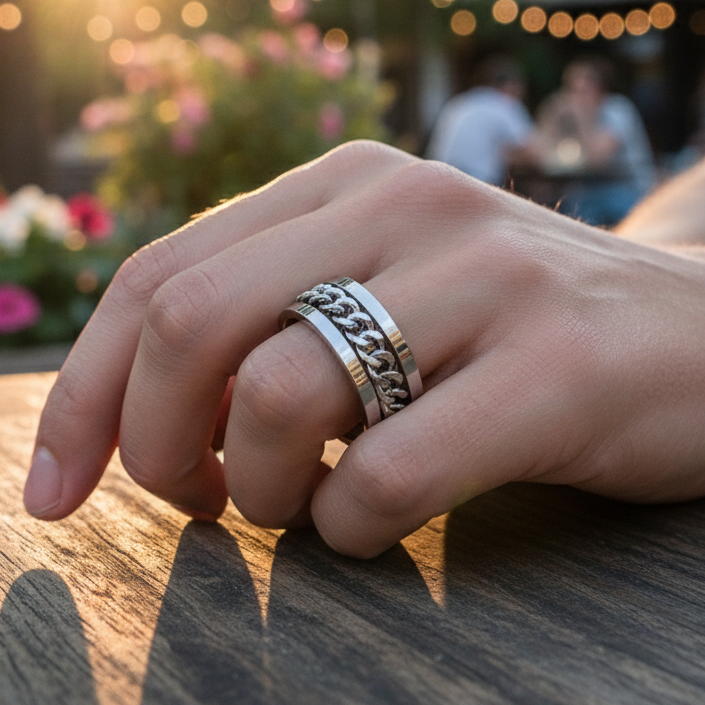 Dieser unglaubliche Ring hat zwei Kräfte. Sind Sie nervös oder gelangweilt bei einem Meeting? Die zentrale Kette dreht sich sanft und geräuschlos und bietet Ihnen ein perfektes, diskretes Ventil für Ihre Unruhe, das Ihnen hilft, konzentriert zu bleiben. Die Party fängt gerade erst an? Seien Sie der Held. Der robuste, verstärkte Rand des Rings ist fachmännisch konstruiert und dient als leistungsstarker und zuverlässiger Flaschenöffner , der immer zur Hand ist, wenn Sie ihn brauchen. So sind Sie nie wieder unvorbereitet.