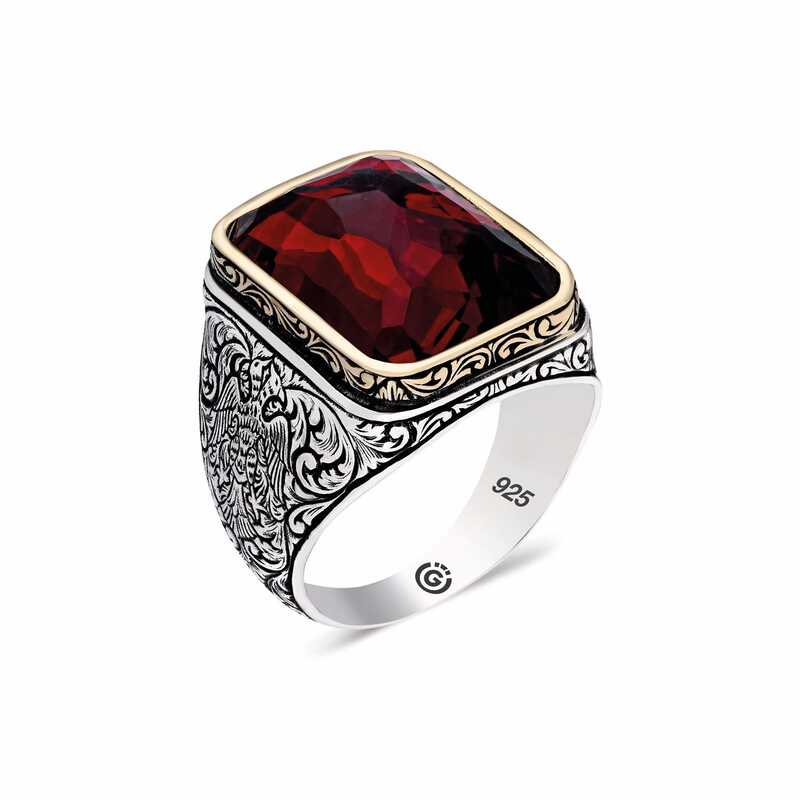 Quadratischer Herren-Silberring mit rotem Zirkoniastein