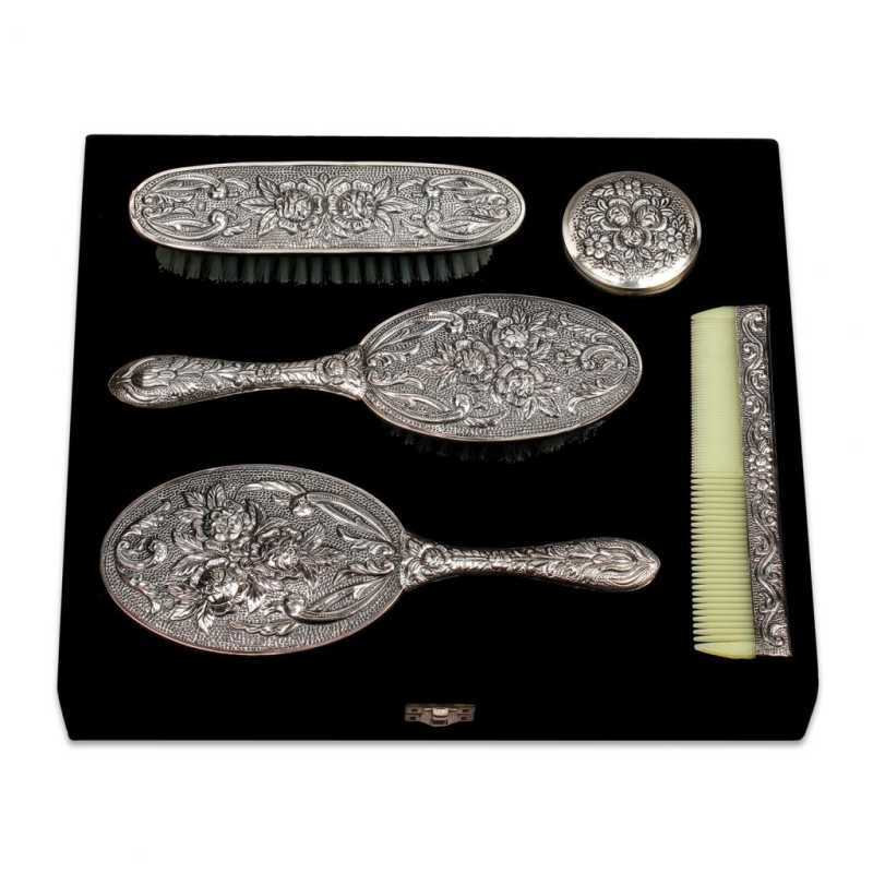 Nos miroirs, brosses et peignes en argent aux motifs uniques sont des accessoires parfaits pour vous et vos proches. Leurs différentes tailles les rendent pratiques à transporter dans votre sac. Le produit est livré dans un écrin cadeau en velours. Tous nos articles sont fabriqués à la main et, en raison de la présence de pierres précieuses, le poids peut varier de ± 10 %. Fabriqués par des artisans orfèvres, le miroir, la brosse et le peigne en argent à motif de roses éblouissent par leur beauté saisissante. Ces pièces exquises peuvent être offertes comme accessoires de maison en argent ou utilisées comme coiffeuse de mariée.