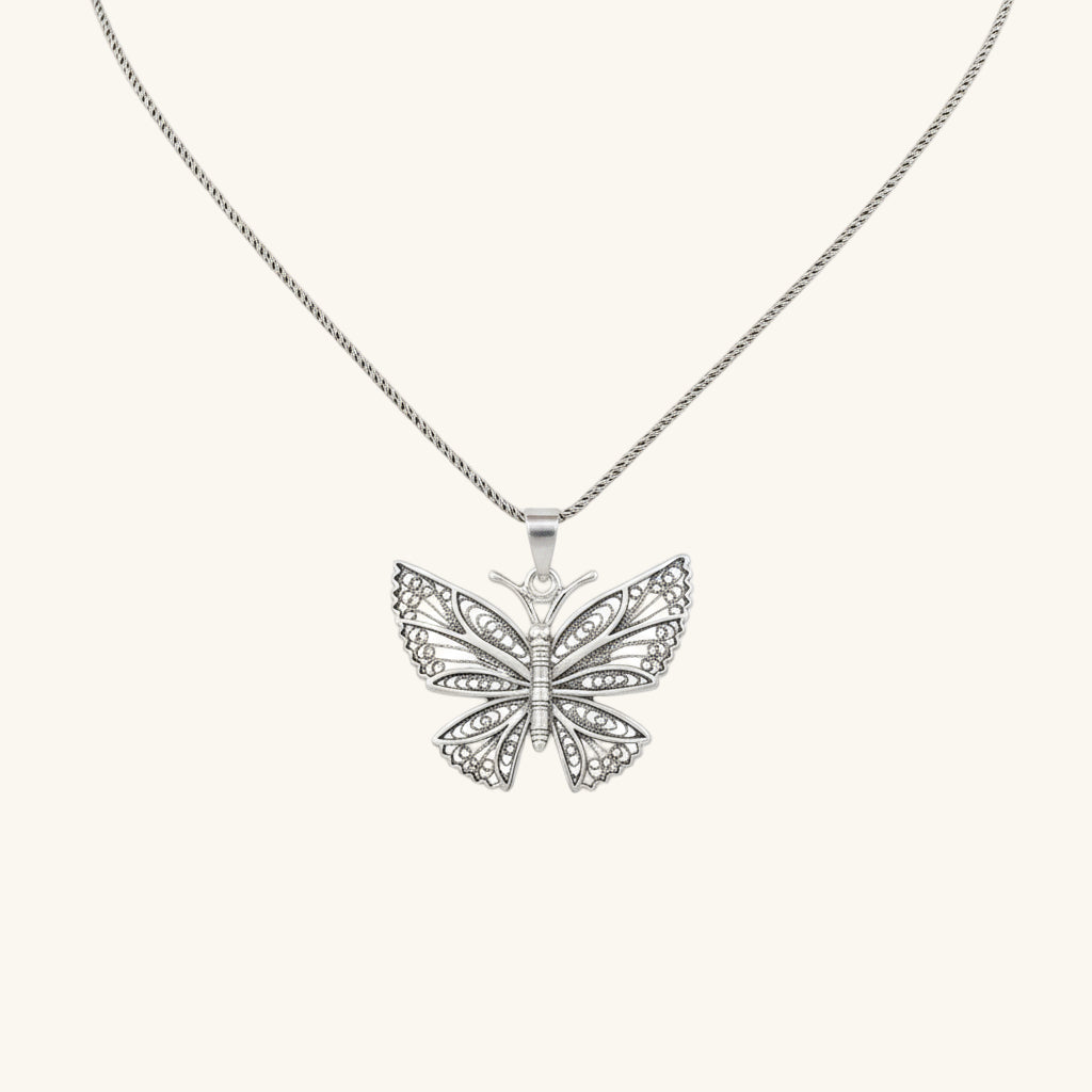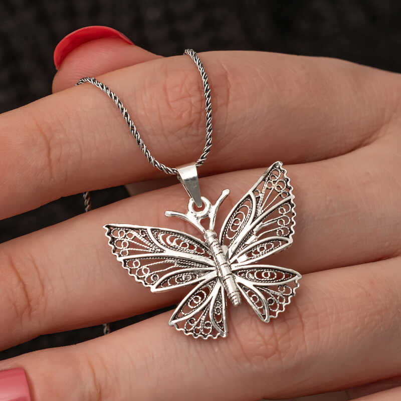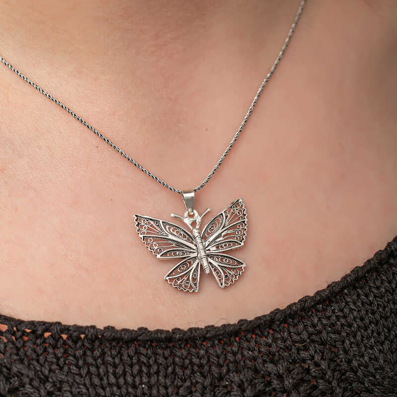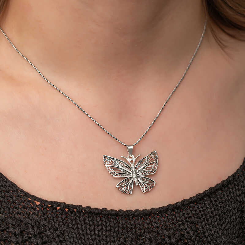 Les papillons, symboles de liberté, d'innocence et de pureté, expriment un amour et une affection immaculés. Le collier papillon printanier symbolise l'amour naissant d'une petite étincelle, grandissant avec patience et culminant dans une déclaration d'amour. Ce collier papillon en filigrane d'argent pour femme, que vous et vos proches apprécierez porter, sera un cadeau des plus précieux. Tous nos produits sont fabriqués à la main. En raison de la présence d'argent et de pierres précieuses, le poids moyen indiqué peut varier de ± 10 %.