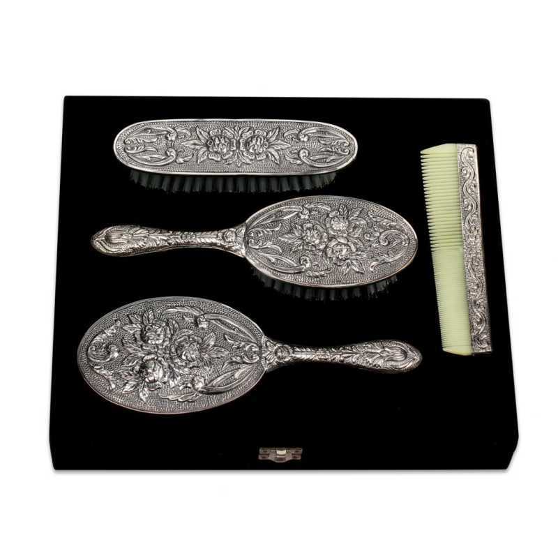 Nos miroirs, brosses et peignes en argent aux motifs uniques comptent parmi les plus beaux accessoires pour vous et vos proches. Leurs différentes tailles les rendent pratiques à transporter dans votre sac. Le produit est livré dans un écrin cadeau en velours. Tous nos produits sont fabriqués à la main et, en raison de la présence d'argent et de pierres précieuses, leur poids peut varier de ± 10 %. Fabriqués entièrement à la main par des orfèvres professionnels, le miroir, la brosse et le peigne en argent à motif de roses sont présentés à nos clients avec leur éclat éblouissant. Vous pouvez considérer ces magnifiques produits comme des cadeaux en argent pour vos proches ou comme un nécessaire de toilette pour votre propre maison.