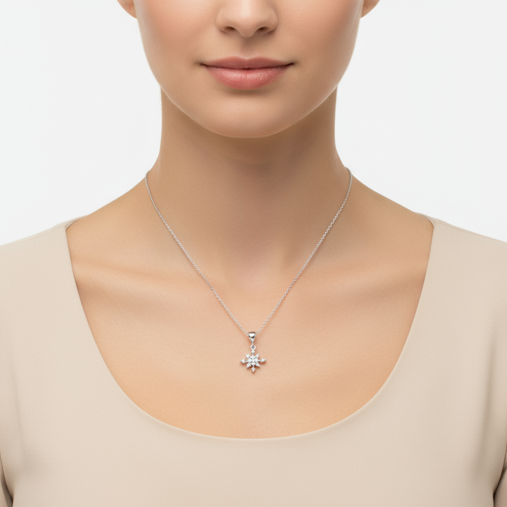 L'éclat et la clarté des femmes sont comparés aux flocons de neige dans cette pièce spécialement conçue. Si chaque flocon de neige est unique et précieux, chaque femme l'est aussi, faisant de ce collier un symbole d'individualité. Son élégance se distingue à toutes les époques et symbolise le bonheur commun, à l'image des flocons de neige. Ce collier élégant est un cadeau idéal pour un anniversaire, la Saint-Valentin ou la fête des Mères. Fabriqué en argent sterling 925 rhodié, il conserve son éclat durable et retarde le ternissement. Les pierres sont des zircons. La longueur moyenne de la chaîne est de 45 cm. Comme tous les colliers en argent pour femme, ce modèle flocon de neige est entièrement fabriqué à la main. En raison de la présence d'argent et de pierres précieuses, le poids moyen indiqué peut varier de ± 10 %.