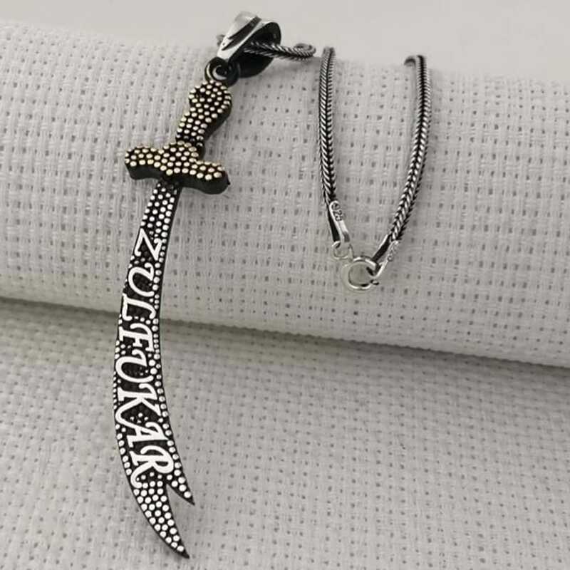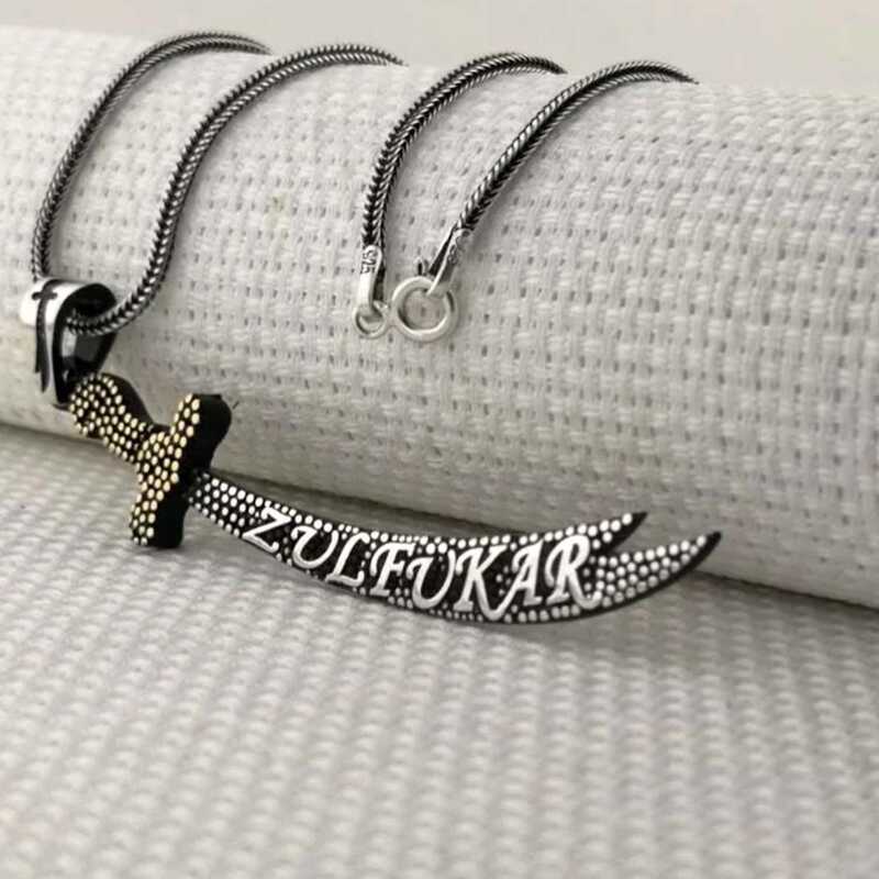 Hazrat Ali fit preuve d'un grand héroïsme lors de la bataille d'Uhud. Alors qu'il tentait de protéger le prophète Mahomet, son épée se brisa. Voyant cela, le prophète Mahomet lui offrit sa propre épée, Zülfikar. Son tranchant lui permit de fendre les autres épées et d'écrire des légendes au cours des batailles. Hazrat Ali combat désormais avec l'épée Zülfikar... Après sa mort, on raconte que l'épée fut emportée au ciel. Un autre récit suggère qu'elle se trouve entre le Tigre et l'Euphrate. Celui qui commandera les armées islamiques en sera le propriétaire et deviendra le commandant suprême des armées. Cet élégant collier peut être offert comme cadeau d'anniversaire, de Saint-Valentin ou pour des occasions spéciales. Le pendentif est en argent sterling 925. Il est recouvert d'un revêtement oxydé. Les colliers en argent avec un revêtement oxydé conservent leur éclat longtemps et donnent à l'argent une couleur noire. Comme tous les colliers, ce pendentif en argent représentant l'épée Zülfikar est entièrement fabriqué à la main. Les pierres qui le composent sont en zircon. En raison de la présence d'argent et de pierres précieuses, le poids moyen indiqué peut varier de ± 10 %.