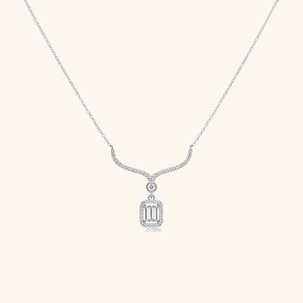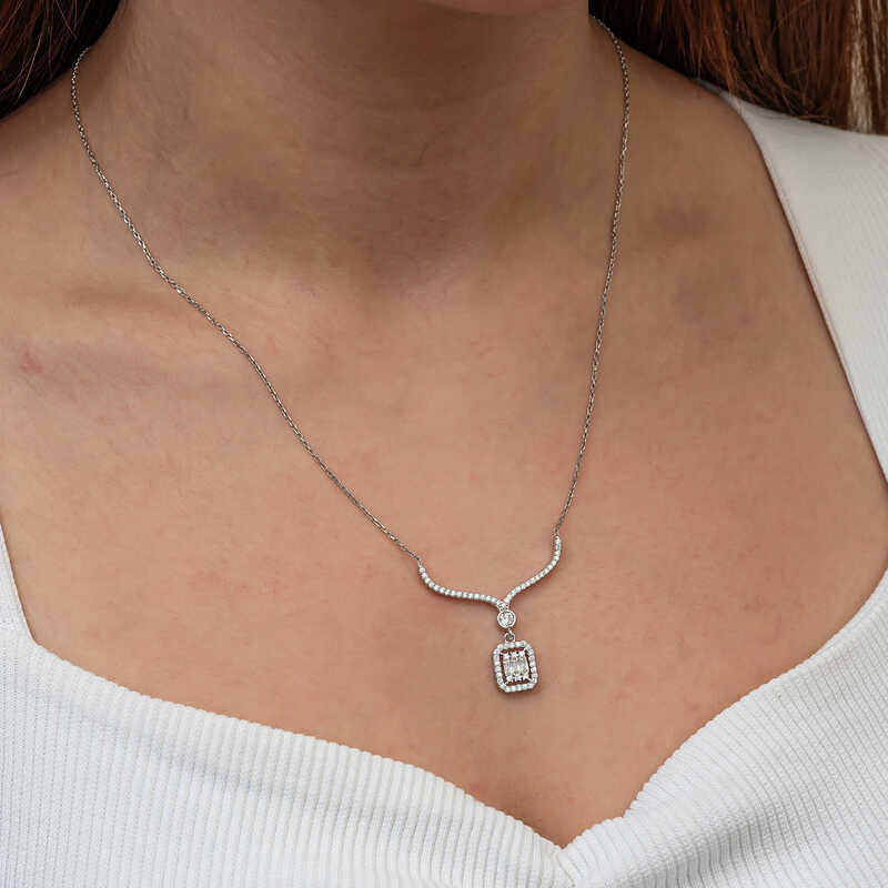 The baguette stone necklace model is a women's pendant design that stands out with its elegance and sophistication. The baguette-shaped stone, typically set on a fine and delicate chain, draws attention with its sharp lines and modern appearance. Offering both a simple and chic look, this baguette necklace is an attractive accessory option for women of all age groups. This model can be comfortably worn in various settings, from daily use to special invitations. It features rhodium plating over silver. Rhodium-plated necklaces maintain their shine for a long time and their tarnishing is delayed. Due to silver and precious stones, the stated average product weight may vary by ±10%.