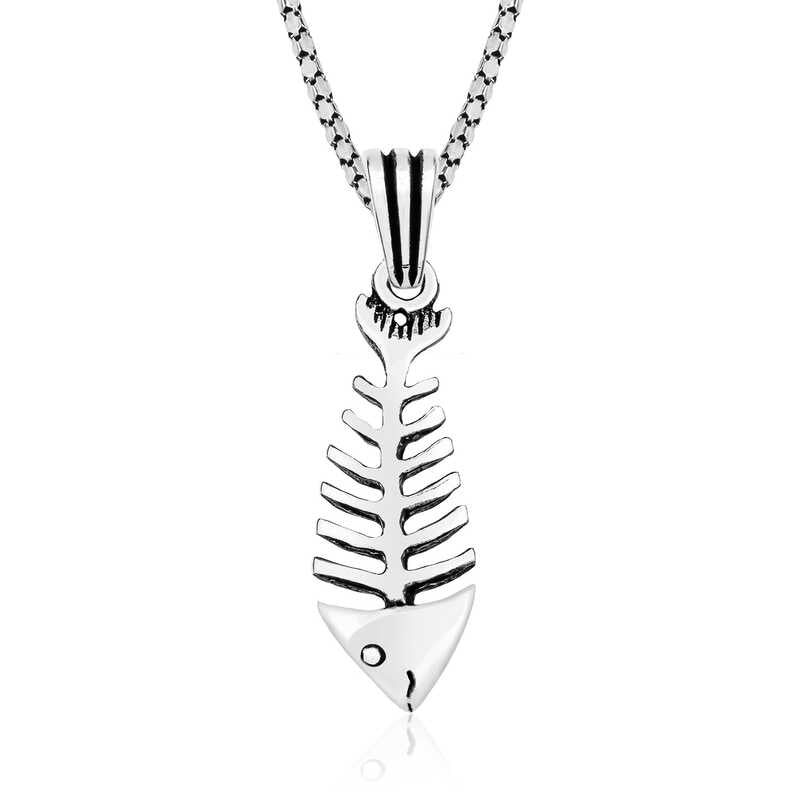 In many cultures, fish symbolize luck and abundance. Additionally, fish embody numerous meanings related to natural life—swimming against the current, prolific reproduction, and free movement. This elegant fish skeleton pendant carries such symbolism in a stylish design. It makes a perfect gift choice for birthdays, Valentine's Day, or special occasions. Crafted from 925 sterling silver, the oxidized plating ensures long-lasting shine and delays tarnishing. The chain length averages 55 cm. All our pendants are handmade. Due to silver and precious stones, the product weight may vary by ±10%.