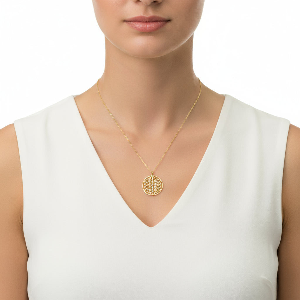 The Flower of Life is a geometric shape consisting of many overlapping circles of equal area and one large outer circle. The center of each circle is at the intersection point of the circumferences of the six circles surrounding it. Drunvalo Melchizedek claims this symbol holds the secrets of the universe and life. It is a lovely accessory that can be worn with pleasure at any time of the day. This silver Flower of Life women's pendant is crafted from 925 sterling silver. This pendant features a gold plating. Gold plated products maintain their shine for a long time. Like all silver women's pendant models, the silver Flower of Life women's pendant model is also handcrafted. Due to silver and precious stones, the stated average product weight may vary by ±10%. All our products are handcrafted.