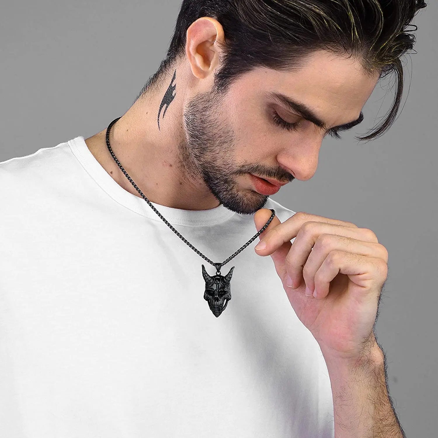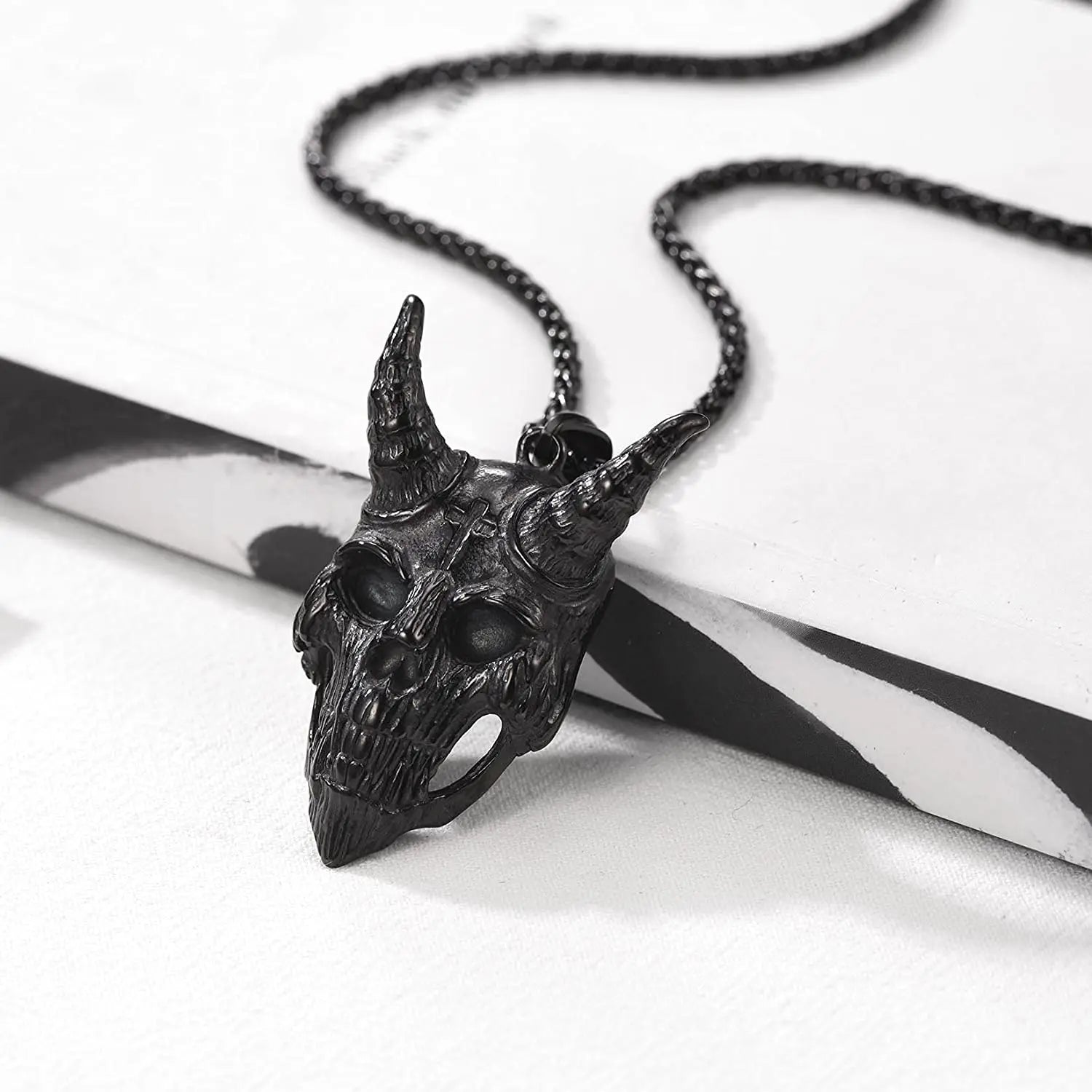 With its potent symbolism and dark, neo-gothic style, this necklace is a powerful statement piece for all genders. The striking pendant is suspended from a durable and stylish Wheat chain, making it a standout accessory in any Gothic, Punk, or Metal ensemble. It is a definitive mark of your unique identity and a perfect gift for the gothic soul, the metalhead, or the esoteric seeker in your life.