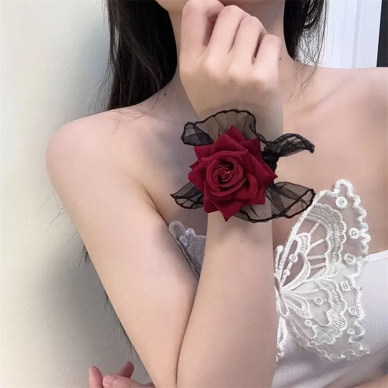 It's all in the details. Instantly transform any outfit into a masterpiece of gothic elegance with these exquisite lace wrist cuffs. Delicately ruffled and adorned with a soft rose, they are a whisper of Victorian romance and dark fantasy, designed to make your look truly unforgettable and complete.