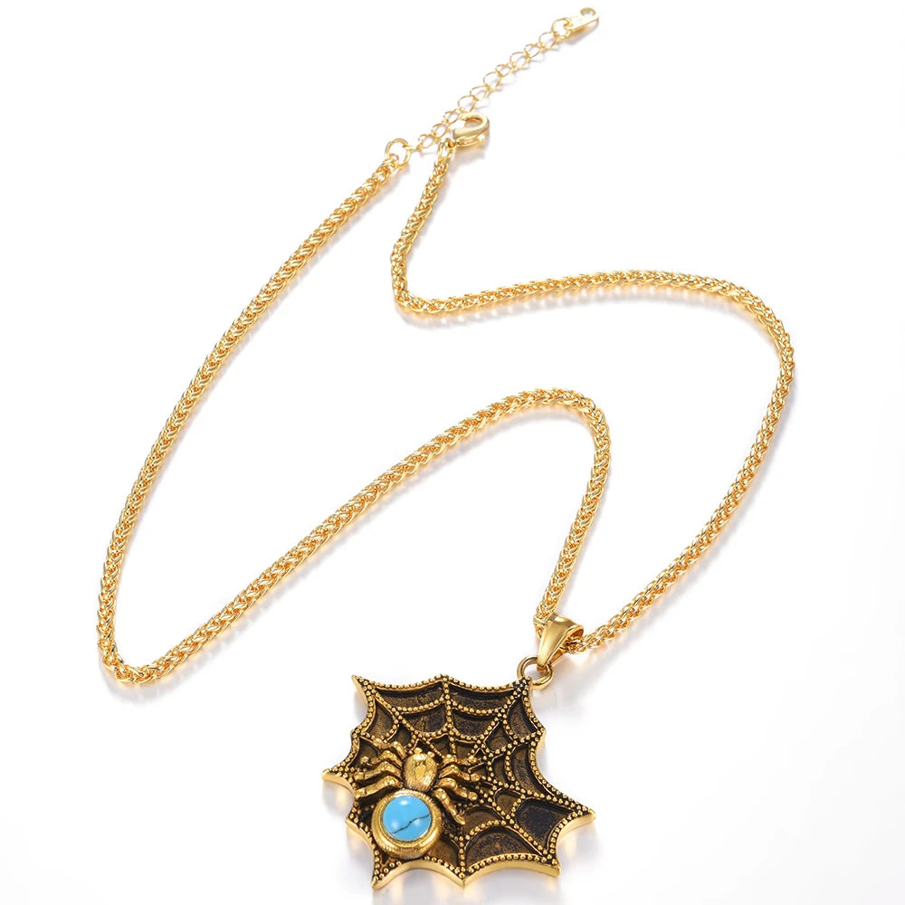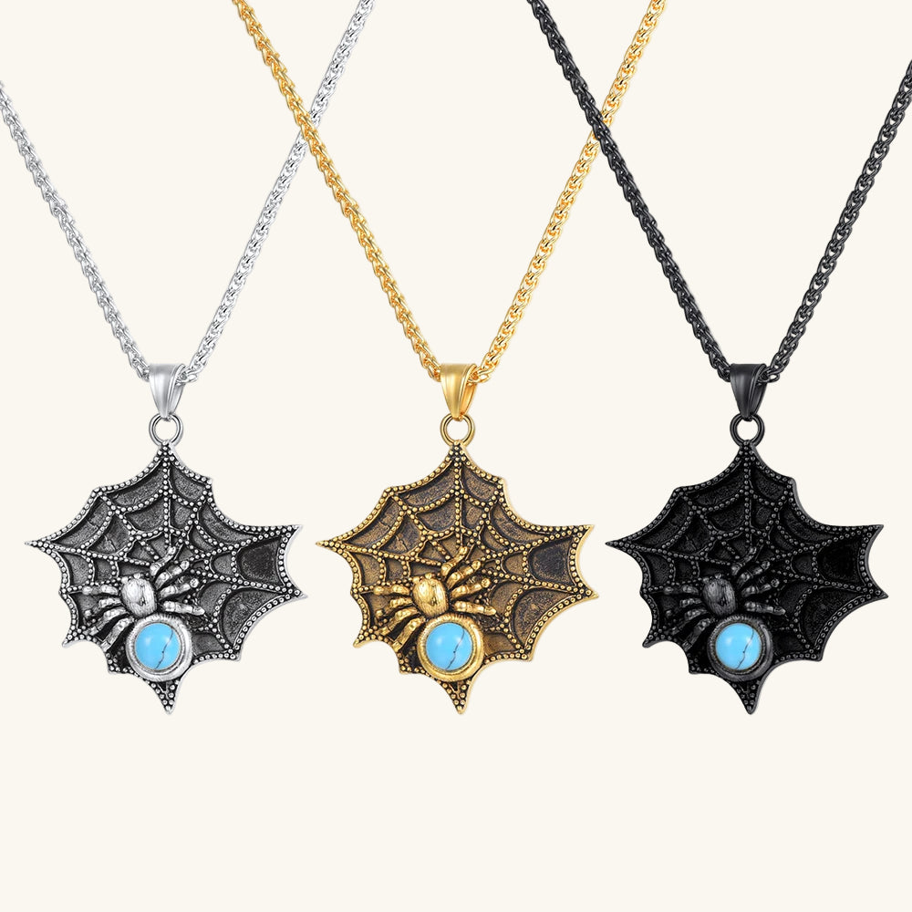 Material Solid 316L Stainless Steel (Nickel-Free) Features Waterproof, Tarnish-Free & Hypoallergenic Pendant Large 6cm Spiderweb Design with a Central Turquoise Bead Chain Stylish and Durable Wheat Chain (50cm+5cm) Finishes Available in 18K Gold Plated, Black, or Polished Steel Gender Unisex