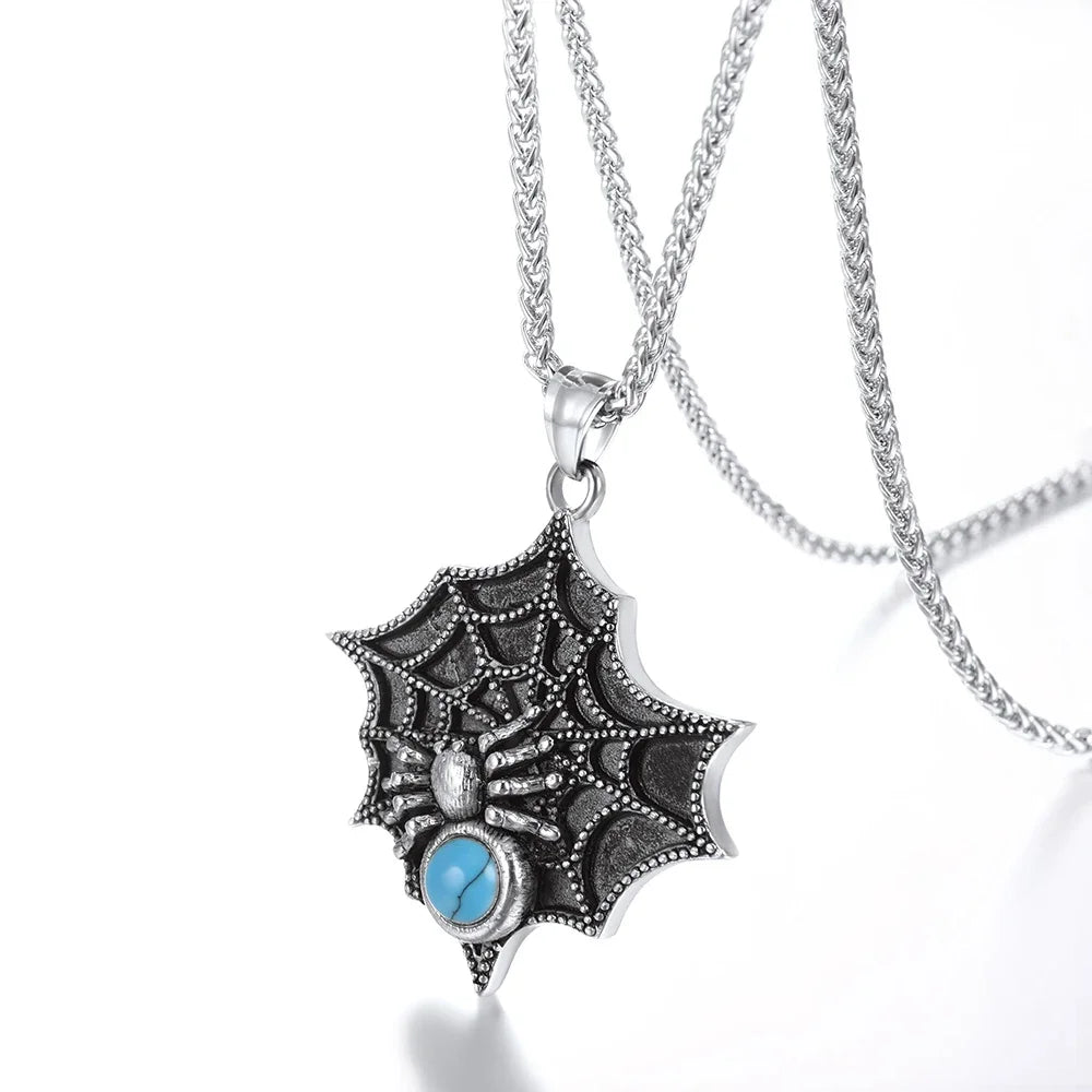 This is a necklace designed to be noticed. The large, 6cm pendant showcases the intricate details of the web, at the center of which lies a striking Blue Turquoise bead—a captivating pop of color that seems to hold its own secrets. The pendant is suspended from a stylish and durable Wheat chain and is available in three stunning finishes: radiant Gold, menacing Black, or classic Polished Steel. It's the perfect, dramatic centerpiece for your Halloween costume and a definitive accessory for your year-round Gothic and Punk wardrobe.