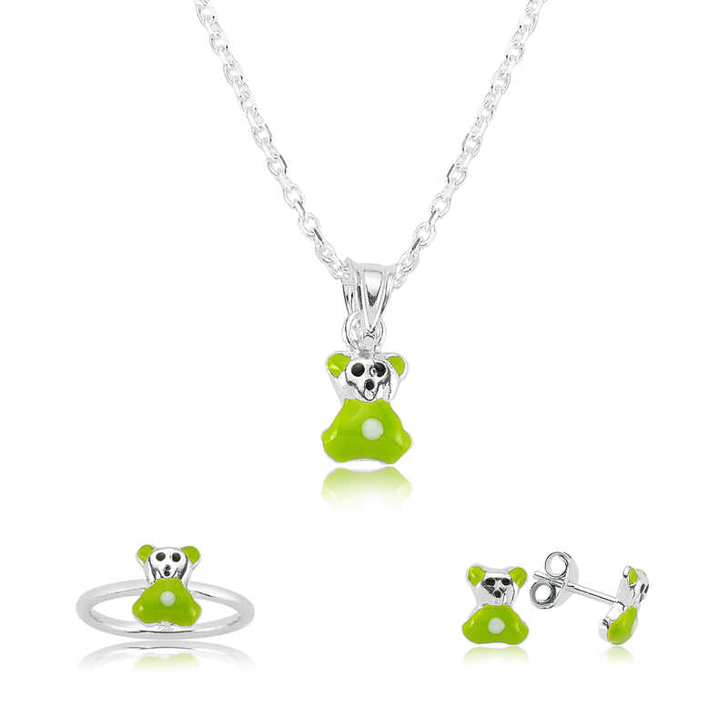 Gümüş Yeşil Ayıcık Çocuk SetÇocuklarımızın cıvıl cıvıl hayatlarına ve rengarenk hayal dünyalarına uygun olarak tasarlanan bu tatlı set ile çocukları mutlu edebilirsiniz. Bu tatlı set ;925 ayar gümüşten imal edilmiştir. Gümüş üzerine rodyum kaplama yapılmıştır. Rodyum kaplama yapılan gümüş çocuk setler parlaklığını uzun süre muhafaza eder ve oksitlenmesi gecikir. Tüm gümüş çocuk setlerde olduğu gibi gümüş yeşil ayıcık çocuk seti de tamamı el emeği ile üretilmiştir. Gümüş ve değerli taşlar nedeniyle belirtilen ortalama ürün ağırlığında ± %10 sapma olabilmektedir.