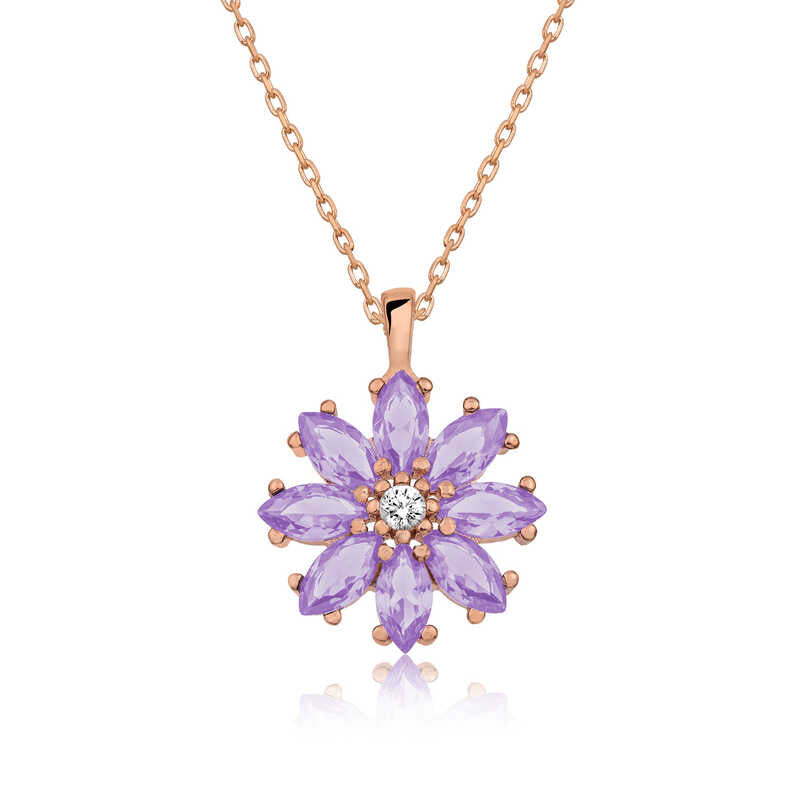 Why not express your feelings to your loved ones with an elegant floral necklace? This stylish necklace, perfect for special occasions and gift-giving, is one of the most beautiful ways to delight those you cherish. Crafted with the highest quality, brightest, and most radiant stones, this rose-plated silver floral necklace awaits those who wish to convey love once more or say, "You are a flower." This special design is made from 925 sterling silver with rose plating, ensuring long-lasting shine and delayed tarnishing. The silver chain has an average length of 45 cm. Like all silver women's necklaces, this lilac flower necklace is handcrafted. Due to silver and precious stones, the stated weight may vary by ±10%.