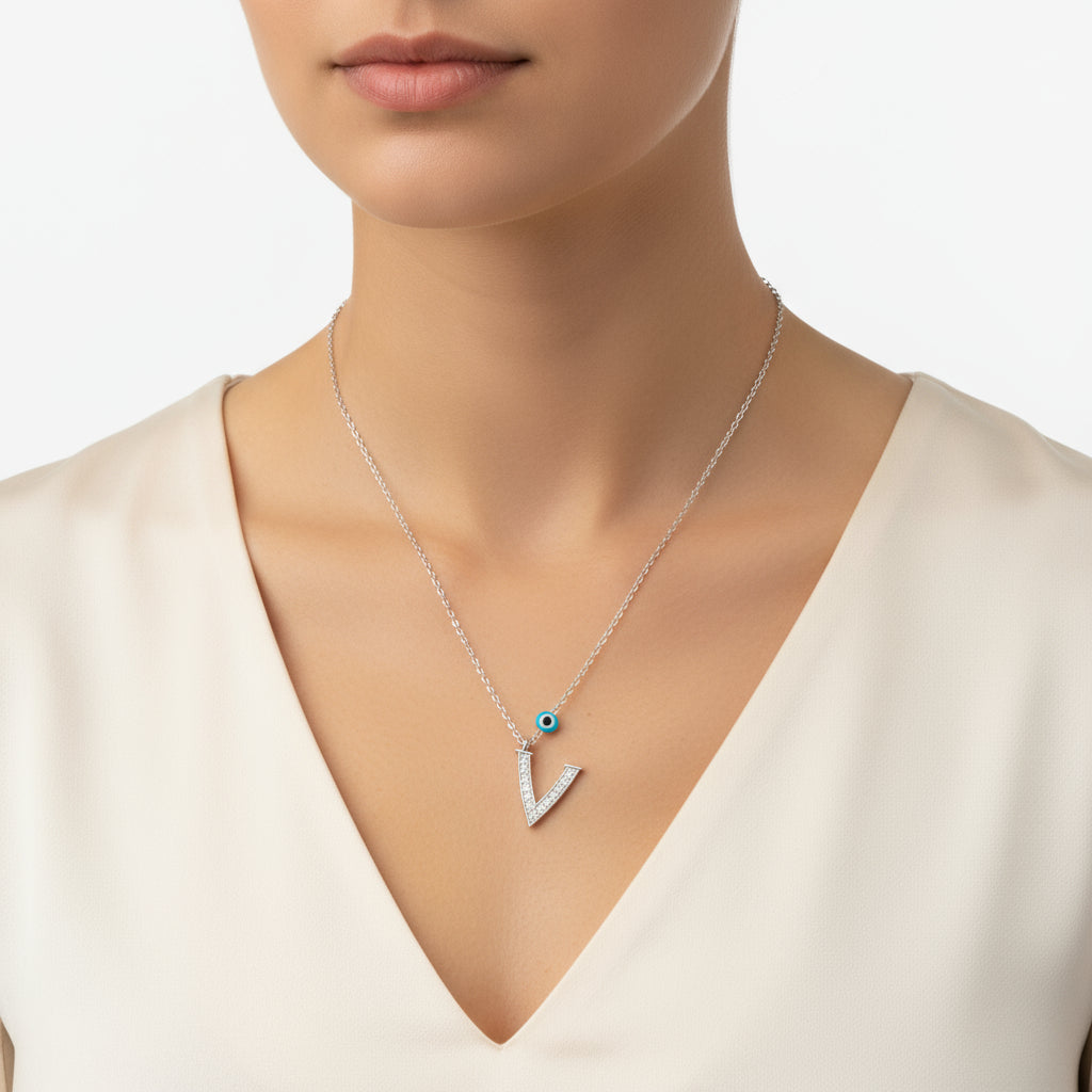 With silver letter necklaces, keep those precious to you always close by... Adorn your loved one's neck with love using this special necklace model, perfect for young couples on special days. This silver letter necklace, which you and your loved ones will enjoy wearing, will be one of the most meaningful gifts. The evil eye letter women's necklace model is crafted from 925 sterling silver. It features rhodium plating over the silver. Silver women's necklace models with rhodium plating maintain their shine for a long time. Like all our products, the silver women's letter necklace model is handcrafted. Due to silver and precious stones, the stated average product weight may vary by ±10%.