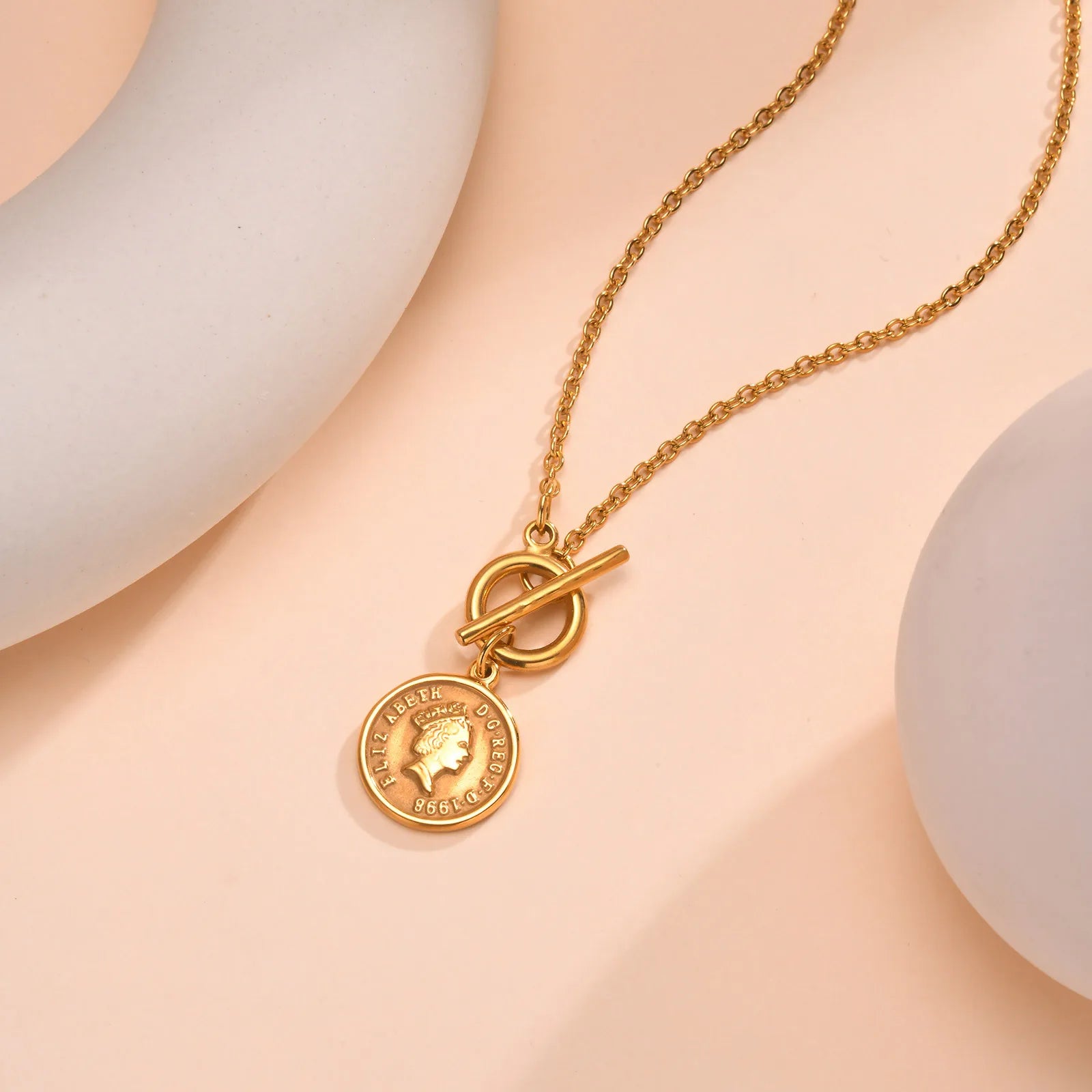 A vintage inspired design that blends elegance with history this Queen Elizabeth medallion necklace is crafted to make a bold yet refined statement