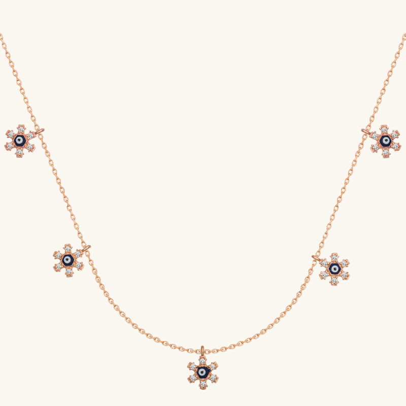 The most special and elegant way to express your feelings to your loved ones is by sending them stylish, colorful, and fragrant flowers. Flowers, a classic gift for special occasions, have been reinterpreted with a unique design this time... This piece awaits those who want to express their love once more with a flower necklace, those who want to say "you are a flower." This special design, the flower evil eye luck women's necklace, is crafted from 925 sterling silver. The silver features a rose gold plating. Rose gold plated silver women's necklace models maintain their shine for a long time and tarnish more slowly. The stones on the necklace are zircon. Like all women's silver necklace models, this silver flower evil eye luck women's necklace is handcrafted. Due to silver and precious stones, the stated product weight may vary by ±10%.