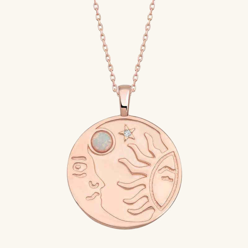 The sun is a symbol of light, knowledge, goodness, power, and governance. The moon, on the other hand, is an important stone representing feminine energy. Known for its properties to balance female hormones, the moon is also a general balancer and calming agent. Because it is also associated with emotions, it is known as a love stone. This dazzling necklace with its radiant and unique design is crafted from 925 sterling silver. The silver features a rose plating. Rose-plated silver products maintain their shine for a long time and tarnish more slowly. Like all silver necklaces, this opal white stone sun moon women's necklace is entirely handcrafted. Due to silver and precious stones, the stated average product weight may vary by ±10%.