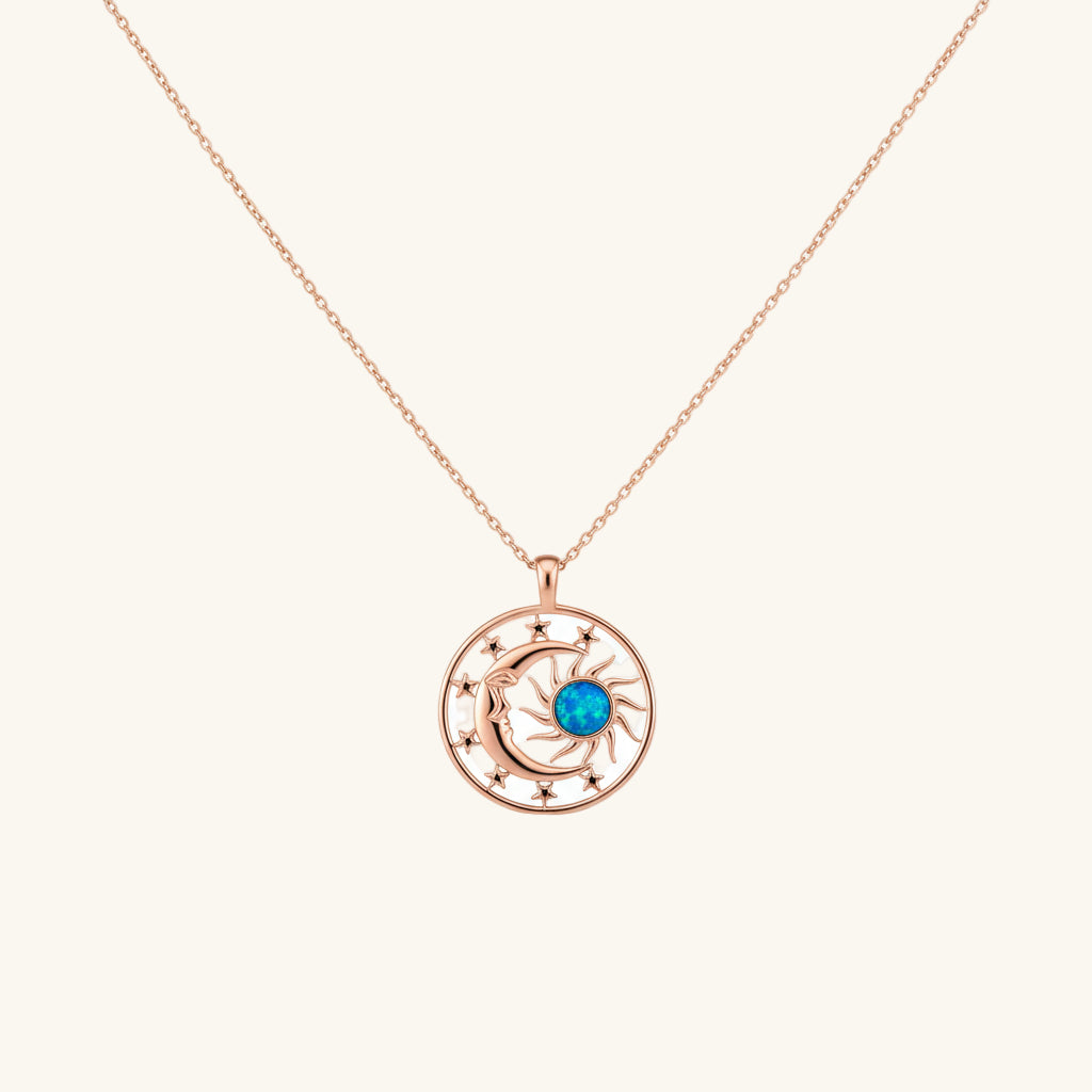 Rose Plated Opal Blue Stone Moon Sun Women's Silver Necklace