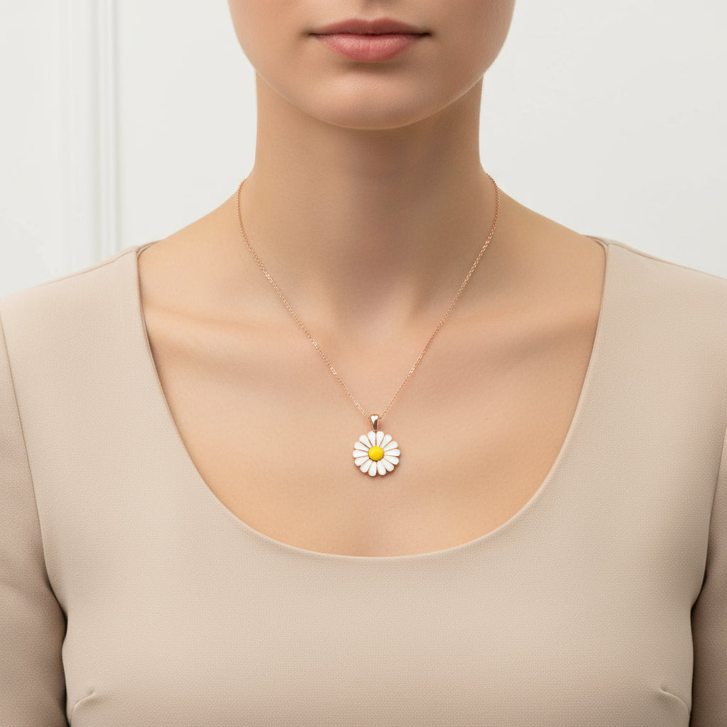 The daisy flower represents pure love. One of its greatest characteristics is that there is only one flower per stem. This elegant pendant, inspired by the "he loves me, he loves me not" game, awaits you. The personalized daisy pendant is an excellent gift choice for birthdays, Valentine's Day, or as a gift for mothers on special occasions. Crafted from 925 sterling silver, this rose plated women's pendant features a rose plating that maintains its shine for a long time and delays the silver from tarnishing. Like all our silver women's pendant models, this personalized daisy silver pendant is handcrafted. Due to silver and precious stones, the stated average product weight may vary by ±10%.