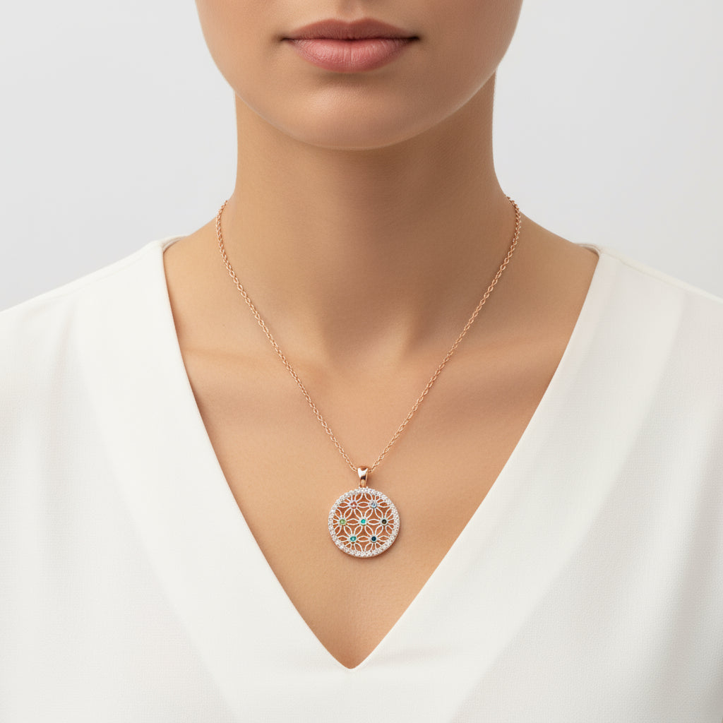 The Flower of Life is the single geometric shape that contains all the secrets and knowledge of creation. In reality, it is not a circle but a sphere. It should be considered in three dimensions, even multi-dimensionally. The Flower of Life contains Plato's five solids and Metatron's Cube. These shapes also construct all of existence. Considered one of the most powerful and special symbols in ancient teachings, the Flower of Life is the essence of the power of eternity, flawlessness, and perfection. You can delight your loved ones or yourself with this special pendant. The Flower of Life women's pendant model is crafted from 925 sterling silver. The silver has been rose plated. Rose-plated silver women's pendant models maintain their shine for a long time and tarnish more slowly. The stones on the pendant are zircon. The average chain length is 45 cm. Like other silver women's pendant models, this Flower of Life model is handcrafted. Due to silver and precious stones, the stated average product weight may vary by ±10%.