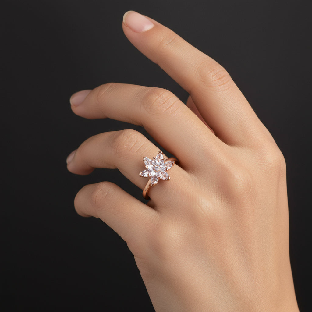 Rose Plated Adjustable White Stone Lotus Flower Women's Silver Ring