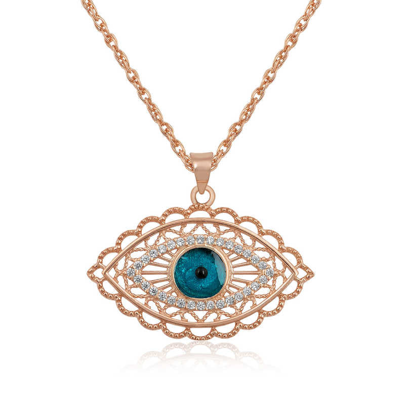 This stylish shuttle evil eye silver necklace will accompany you at any time of the day and add elegance to your outfits. It makes a perfect gift choice for birthdays, Valentine's Day, or special occasions. Crafted from 925 sterling silver with zircon stones, it features rose gold plating that gives the silver a pink-copper hue. Like all silver necklaces, this shuttle evil eye design is handmade. Due to silver and precious stones, the stated average weight may vary by ±10%.