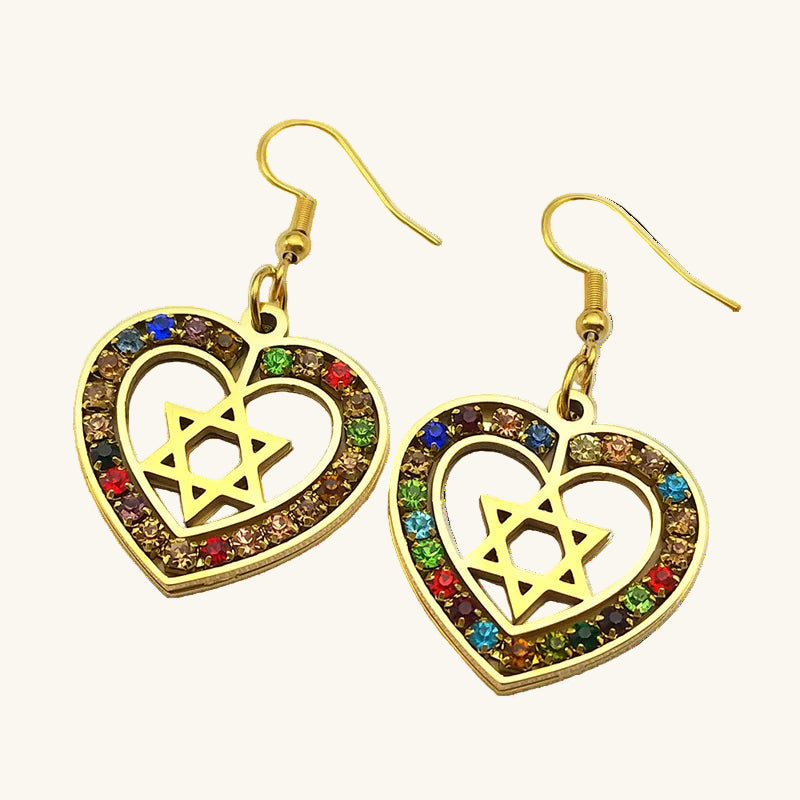 Let your spirit shine with these exquisitely designed drop earrings. They beautifully unite two of the most powerful symbols: the sacred Star of David, representing faith and heritage, and the timeless heart, symbolizing love and deep connection. This is more than an accessory; it's a personal statement of who you are and what you cherish, worn with elegance and pride.