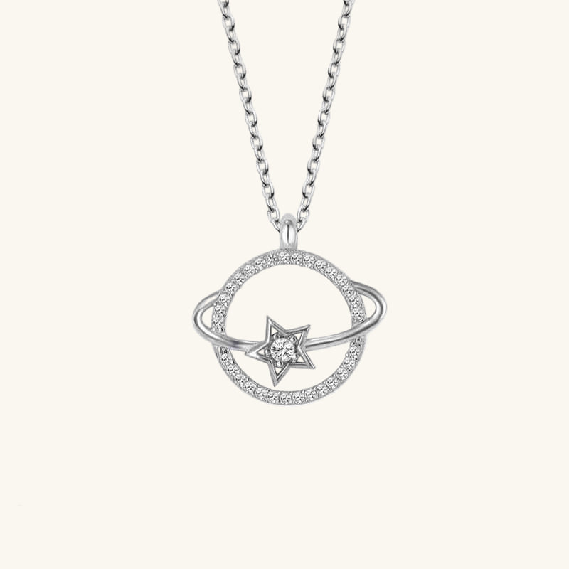 These stones achieve a diamond-like appearance through special cutting techniques and a smooth finish. This necklace, with its unique design, is perfect for daily wear, allowing you to express your style and create various looks. A delightful gift for yourself or loved ones, this Swarovski stone-adorned silver planet necklace is crafted from 925 sterling silver with rhodium plating, ensuring long-lasting shine and delayed tarnishing. The stones are made of glass. Like all silver necklaces, this model is handcrafted. Due to silver and precious stones, the stated average weight may vary by ±10%.