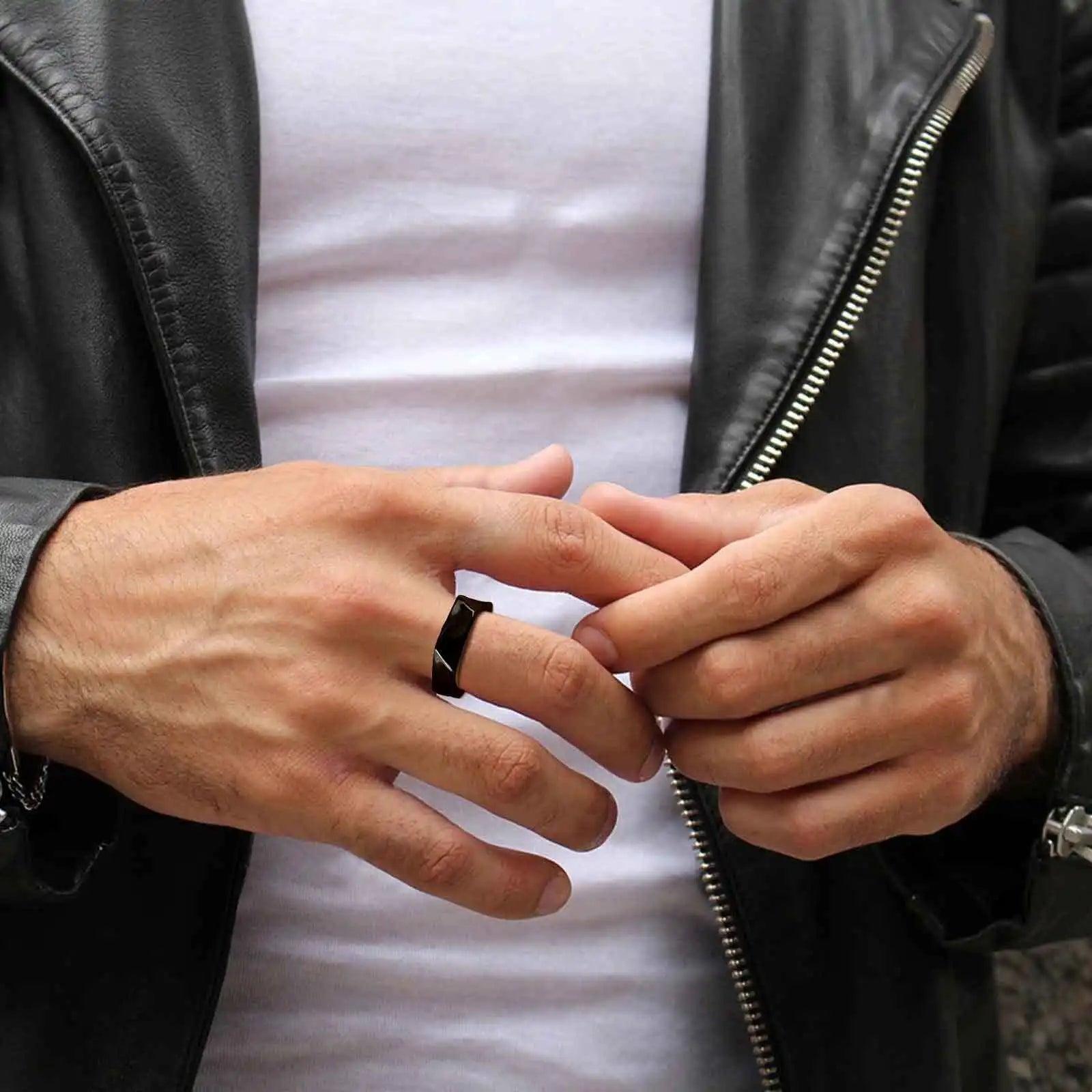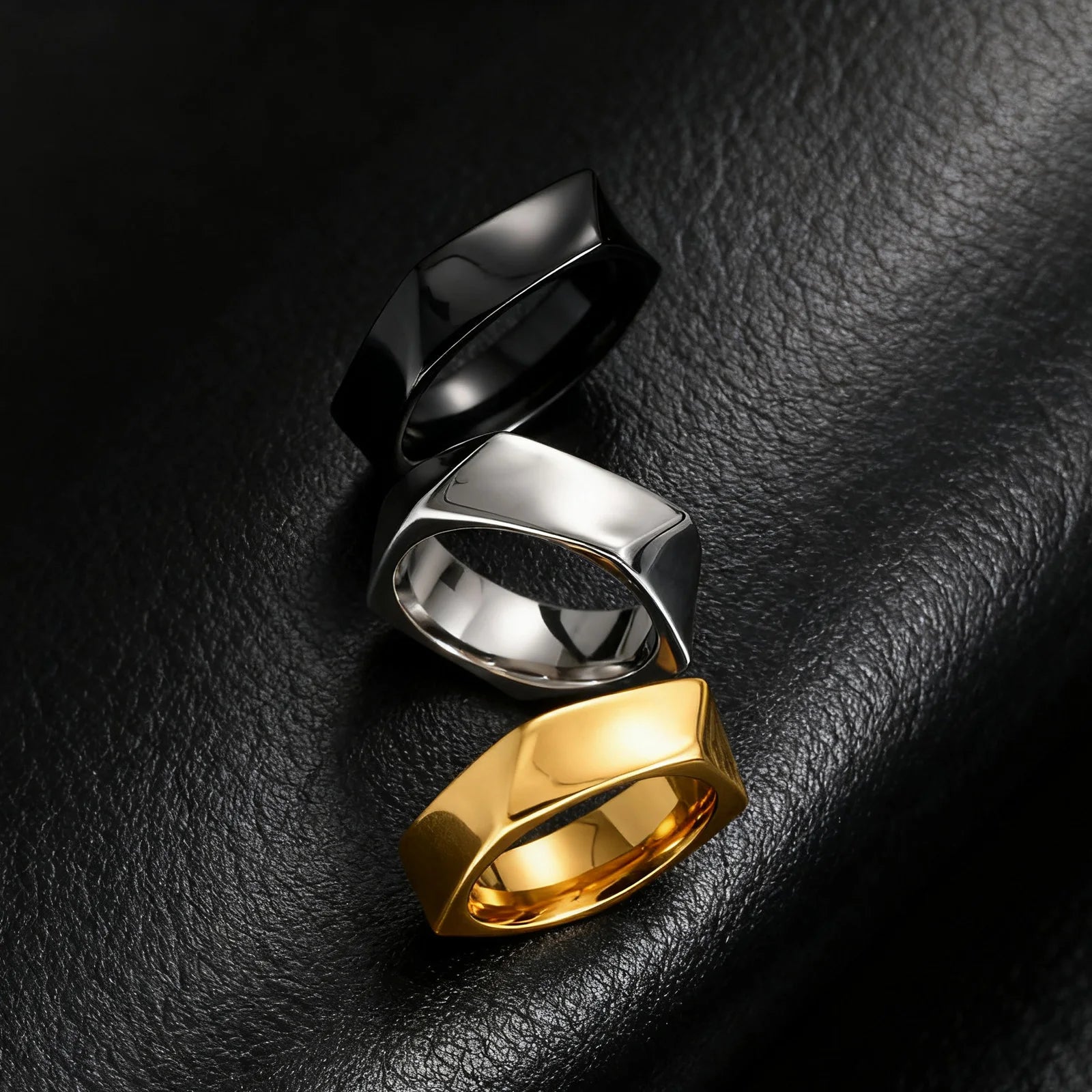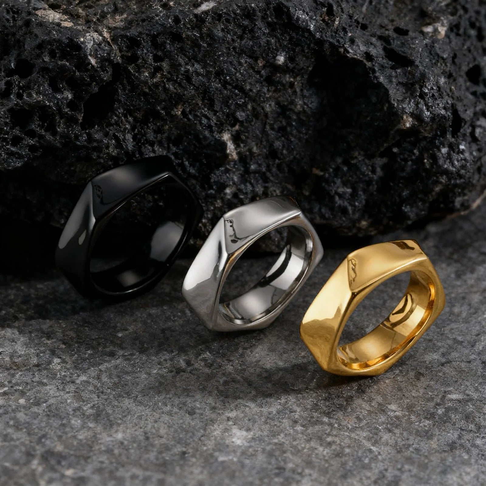 This is the ultimate versatile accessory. Its bold yet understated unisex design makes it a perfect modern wedding band, a chic statement ring, or a cool stacking band for anyone. At a comfortable 6mm width, it has a satisfying presence on the finger without being overwhelming. Available in three stunning finishes—classic Polished Steel, radiant 18K Gold, and menacing Black—you can find the perfect one to match your unique aesthetic. The perfect gift for the minimalist, the architect, or the design lover in your life.
