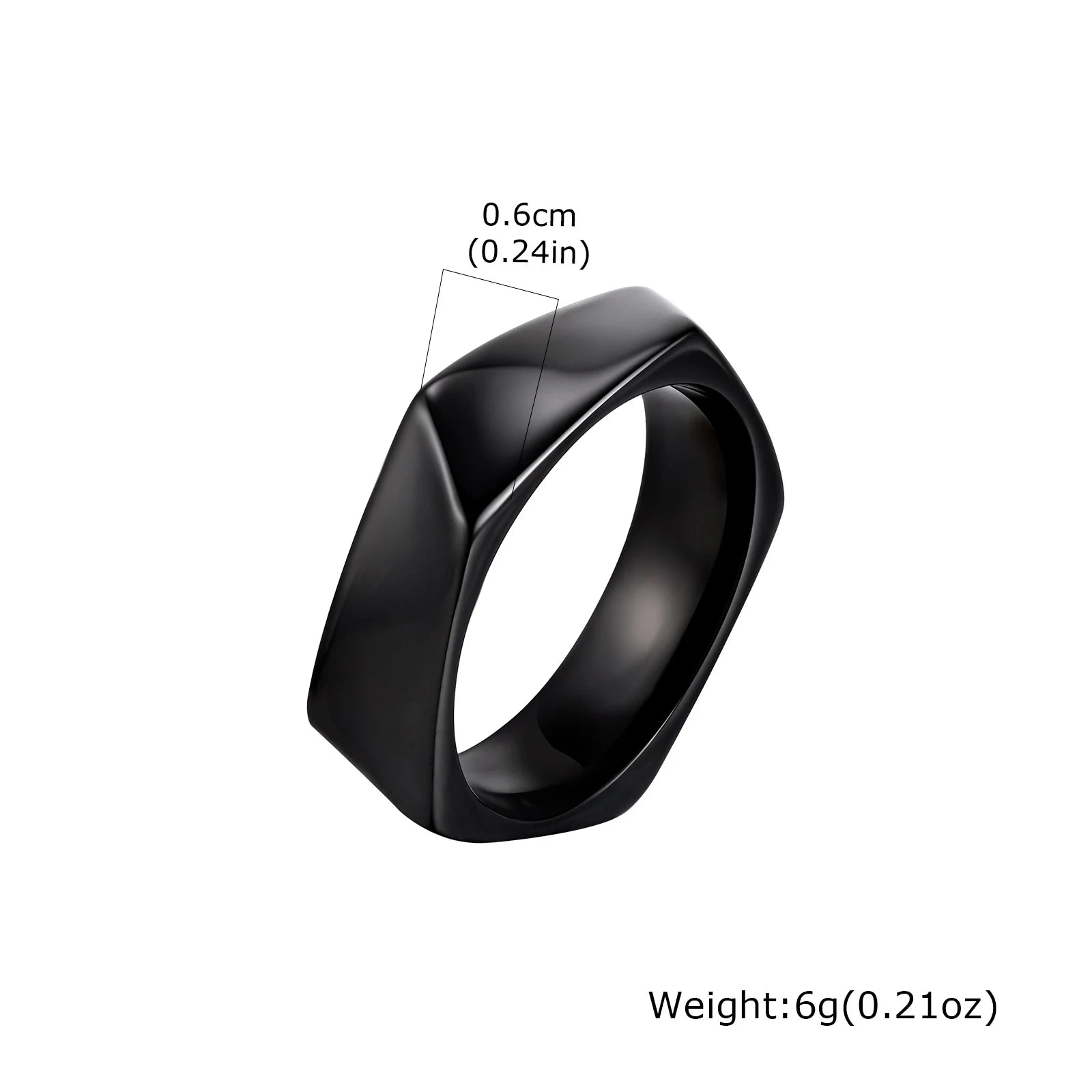 Material Solid 316L Stainless Steel Finishes Available in 18K Gold Plated, Black, or Polished Steel Style Minimalist, Geometric, Modern, Wedding Band Alternative Width 6mm Fit Available in a wide range of sizes for a perfect fit Gender Unisex