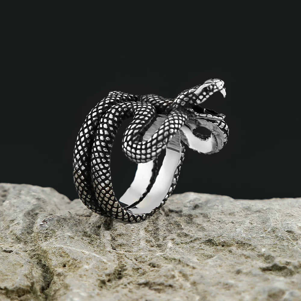 Material Solid, Heavyweight 316L Stainless Steel with a Vintage Finish Style Viking, Norse, Gothic, Punk, Biker, Statement Band Design Solid, Closed-Band Serpent Ring with Intricate Scale Details Fit Available in a wide range of sizes (7-13) for a perfect, solid fit Gender Unisex