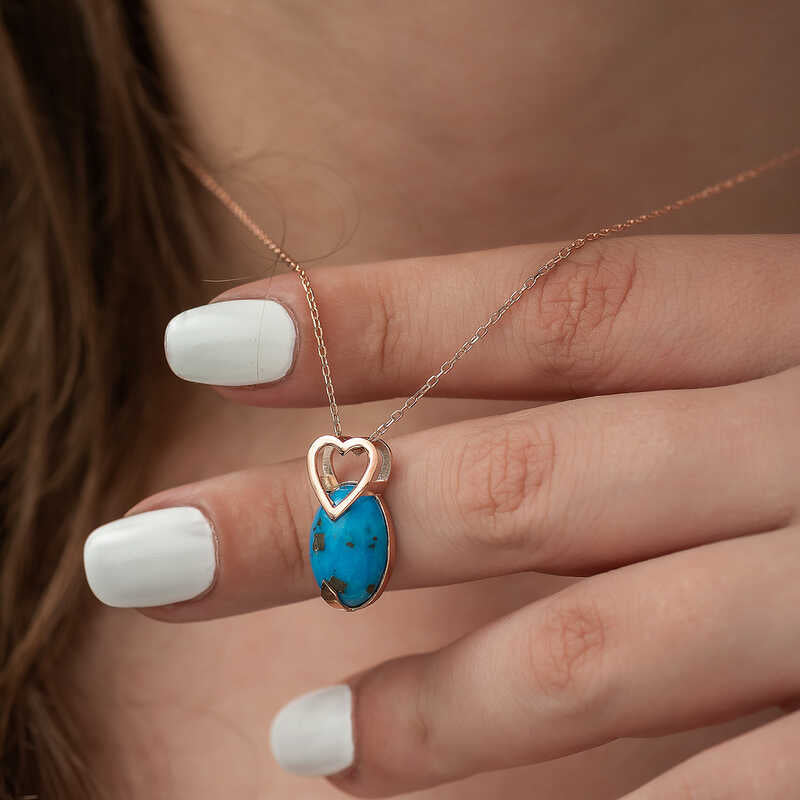 This heart-shaped women's necklace adorned with turquoise stones is a wonderful piece you'll love wearing or gifting to loved ones. The women's silver necklace is crafted from 925 sterling silver with rose plating, ensuring long-lasting shine and delayed tarnishing. The silver chain has an average length of 45 cm / 17.7165 inches. The featured stone is turquoise. Like all our silver women's necklaces, this turquoise stone heart-detailed model is handcrafted. Due to silver and precious stones, the product weight may vary by ±10%.