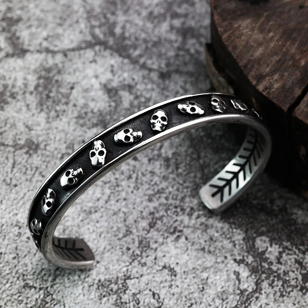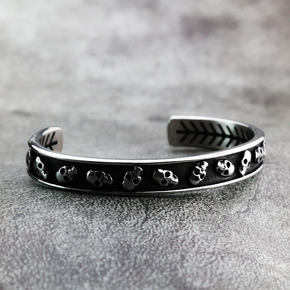The intricate skull details are a testament to a fearless style. The open cuff design is sturdy yet adjustable for a comfortable and secure fit on most wrists. This is a substantial, powerful piece designed to be seen and felt.