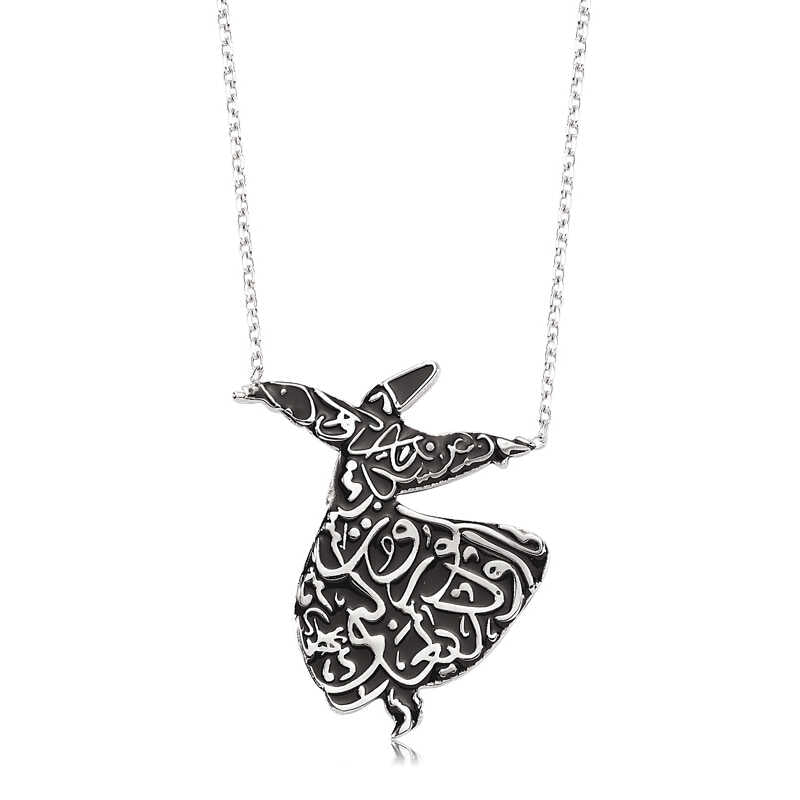 The Sema symbolizes the creation of the universe, human awakening in the cosmos, movement through divine love, and the journey toward spiritual perfection ("Insan-ı Kâmil"). Each movement in the whirling ritual holds deep meaning. Accompanied by the soothing sound of the ney, it brings peace. The dervishes' right hand faces the sky, while the left turns toward the earth—receiving from the Divine and giving to humanity, completing the cycle of rebirth. You can wear this meaningful whirling dervish necklace with love or gift it to loved ones. Crafted with oxidized silver plating, it retains its shine while achieving a distinctive blackened finish. The silver chain has an average length of 45 cm. Like all silver necklaces, this piece is handcrafted. Due to silver and precious stones, the stated weight may vary by ±10%.