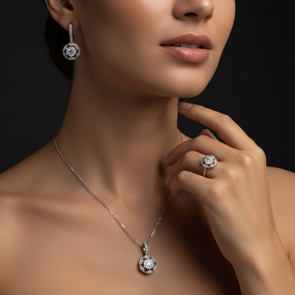 This flower set, composed of white zircon stones, dazzles with its elegance and brilliance. The silver women's set with a floral pattern, designed to accompany you on special and happy days, was created for those who wish to carry the noble, bright, and magnificent appearance of zircon with simple and classic models. Our selection of elegant gifts awaits you for special occasions like birthdays, anniversaries, and celebrations. All our products are handcrafted. Due to silver and precious stones, the stated average product weight may vary by ±10%.